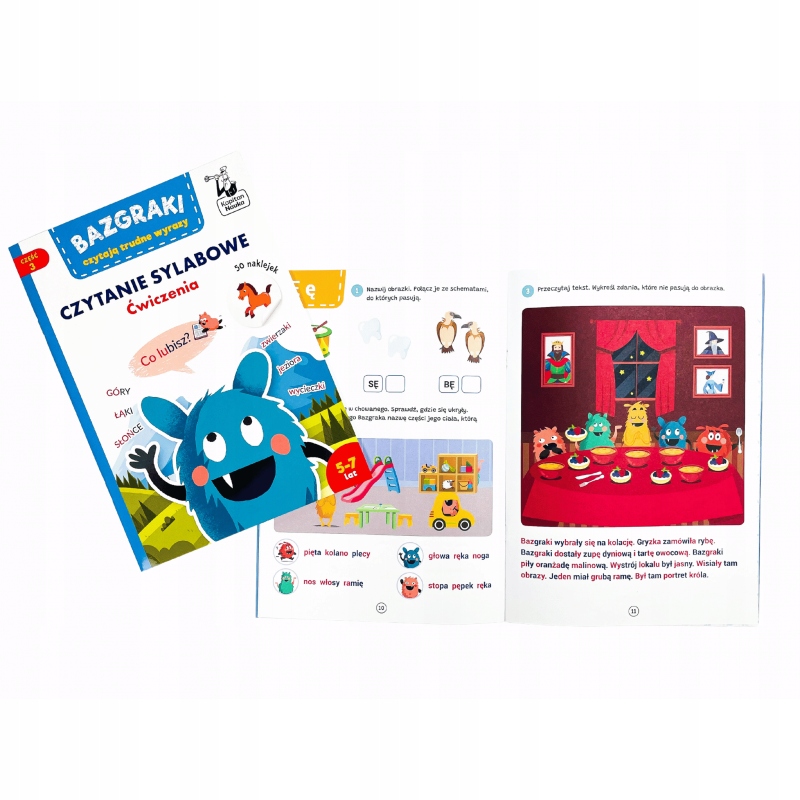 Bazgraki czytają trudne wyrazy. Czytanie sylabowe. Teczka edukacyjna zawiera kompletny zestaw materiałów do nauki płynnego czytania metodą sylabową dla dzieci w wieku od 5 do 7 lat, które znają już wszystkie literki i mają już za sobą pierwsze próby czytania sylabami. Przedszkolak może korzystać z 3 książeczek równolegle, dzięki czemu będzie miał szeroki wybór ćwiczeń i możliwość łatwego dopasowania ich do swoich bieżących potrzeb. Łącznie to aż prawie 100 stron pełnych łamigłówek oraz ponad 150 kolorowych naklejek !