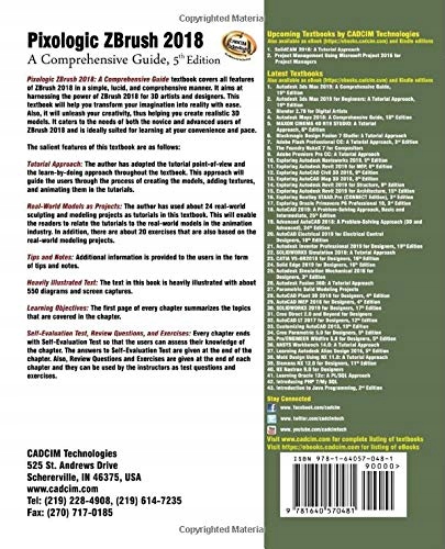 Consists of 12 chapters & 1 project that are organized in a pedagogical sequence. Covers all aspects such as modeling, texturing, lighting, & animation in ZBrush. Tutorial approach to explain the concepts and usage of tools. First page of every chapter summarizes the topics that are covered in the chapter. Additional information is provided throughout the book in the form of notes and tips. Self-Evaluation test & Review Questions at the end of each chapter so that the users can assess their knowledge.