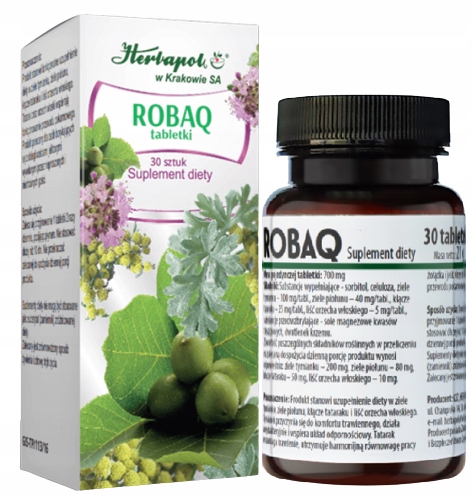 Składniki: Substancje wypełniające - sorbitol, celuloza, ziele tymianku – 100 mg/tabl., ziele piołunu – 40 mg/tabl., kłącze tataraku – 25 mg/tabl., liść orzecha włoskiego – 5 mg/tabl., substancje przeciwzbrylające - sole magnezowe kwasów tłuszczowych, dwutlenek krzemu.