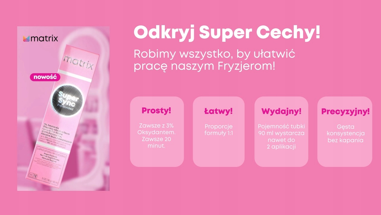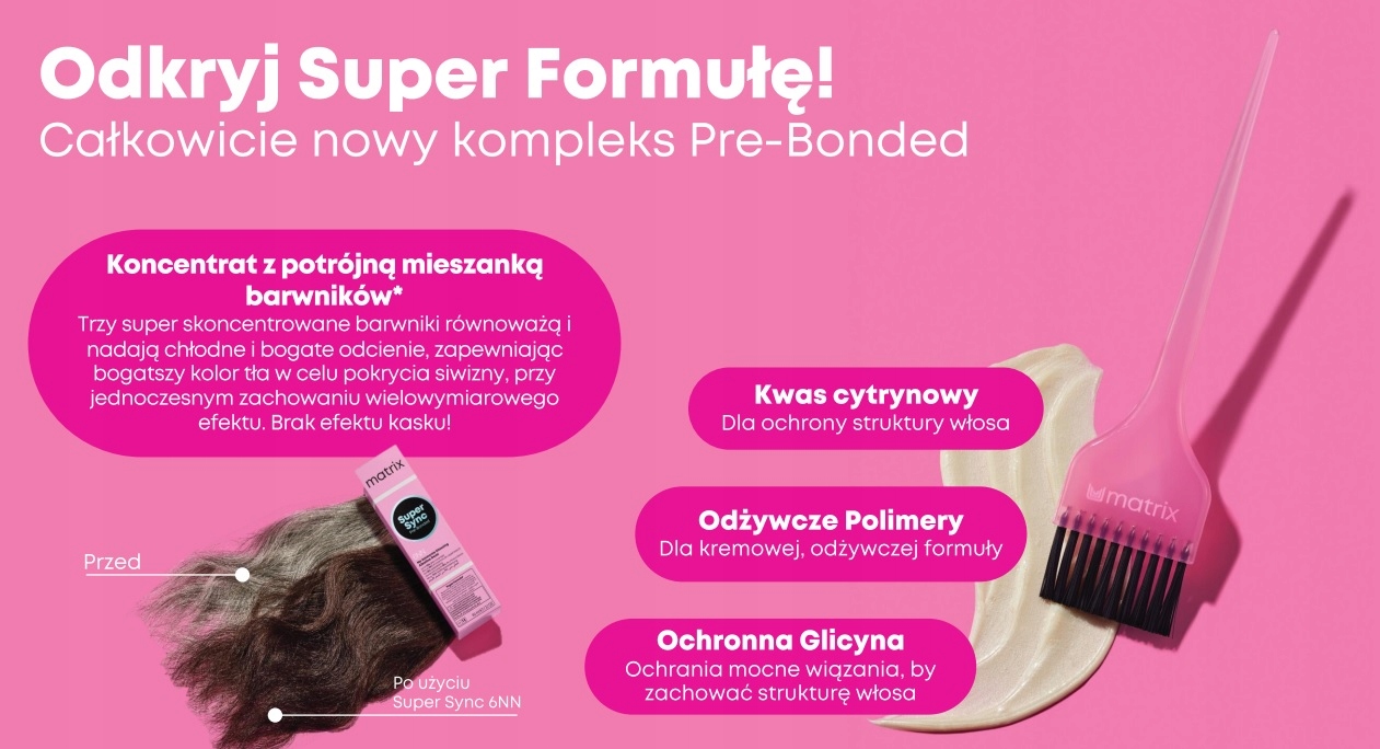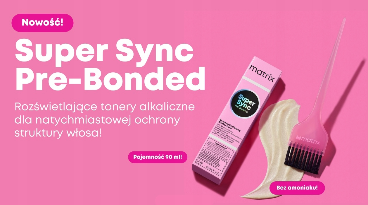Nie musisz dalej szukać- przedstawiamy tonery Matrix Super Sync Pre-bonded- demi-permanentne farby bez amoniaku, które zapewnią Ci SUPER ochronę, SUPER krycie i pozostawią Twoje włosy SUPER miękkie.
