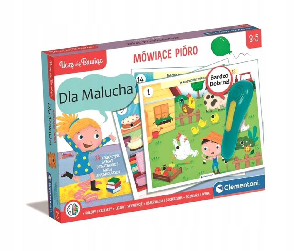 Zabawna gra przeznaczona dla dzieci od 3 roku życia. Program edukacyjny dostosowano do potrzeb najmłodszych dzieci i wsparto ilustracjami, które mają pomóc im w nauce kształtów i kolorów oraz orientacji w przestrzeni. Stymuluje rozwój umiejętności logicznych, zmysł obserwacji i zdolność kojarzenia. Ergonomiczne i interaktywne mówiące pióro pomaga dziecku odkryć poprawną odpowiedź. Mnóstwo kart do gry, wykonanych z solidnego kartonu powlekanego tworzywem sztucznym, z 24 zabawnymi zadaniami. Panel jest wyposażony w uchwyt i praktyczną komorę na karty.