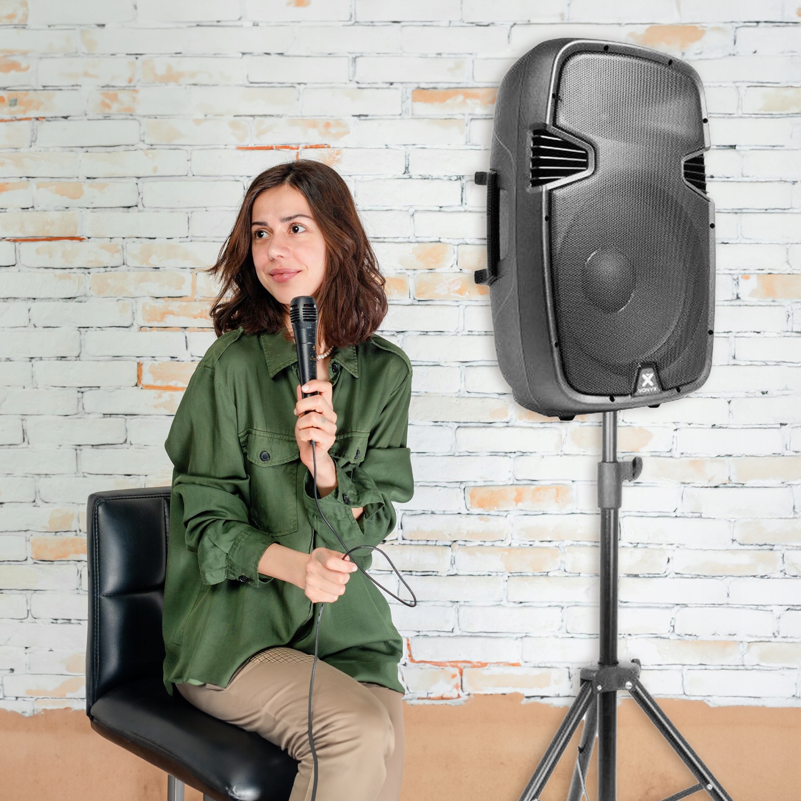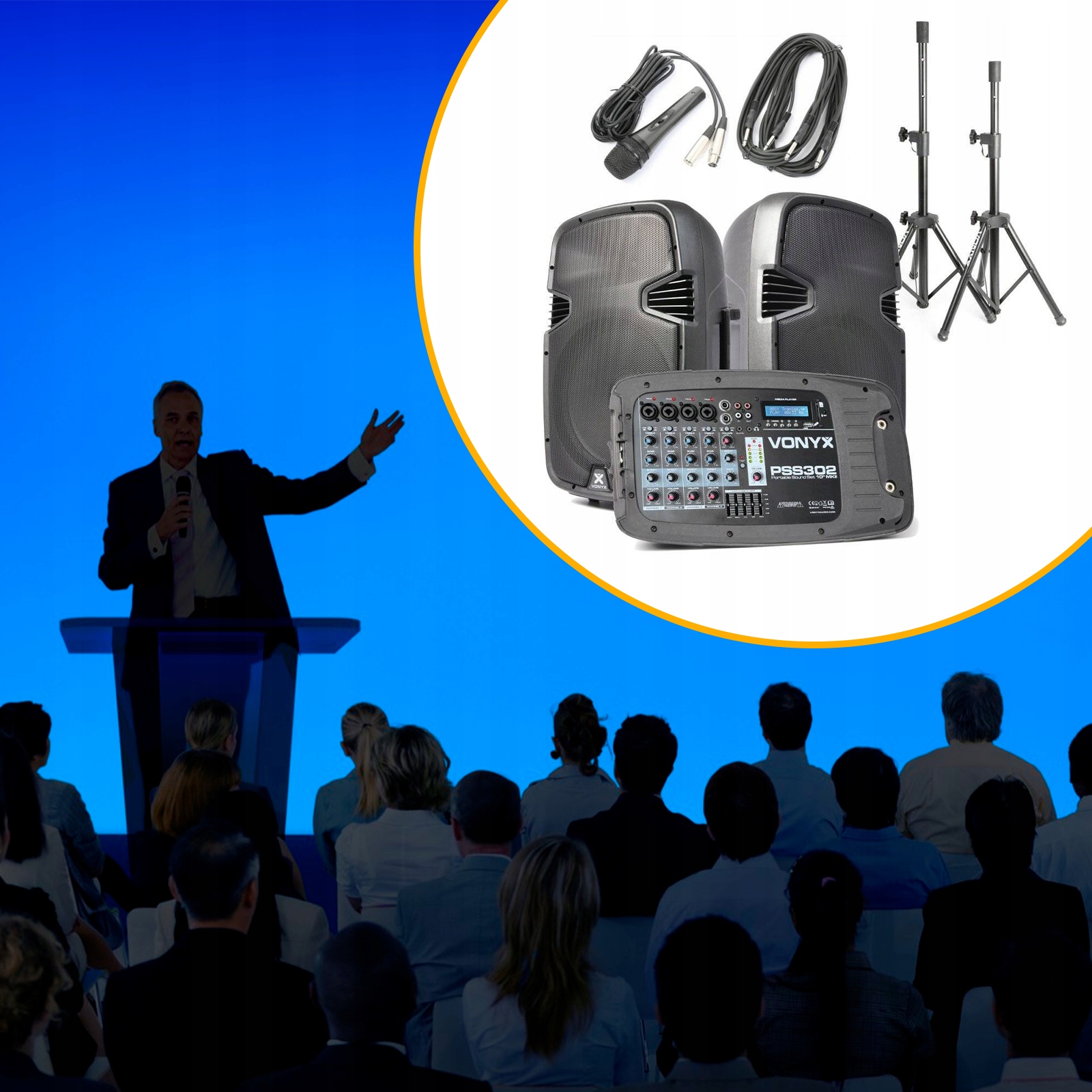 Pełny system 300W z aktywnym mikserem i schowkiem. Do systemu dołączony jest wysokiej jakości mikrofon przewodowy, dzięki czemu zestaw można od razu wykorzystać do wielu zastosowań takich jak przemówienia, prezentacje, pokazy, imprezy itp.