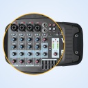 Ten mikser (ale także schowek) można łatwo przymocować z tyłu głośników, dzięki czemu wszelkiego rodzaju luźne przedmioty są ograniczone do minimum. Mikser o mocy 2x 150W „klasy D” jest aktywny, a więc z wbudowanym wzmacniaczem i kilkoma wejściami mikrofonowymi i liniowymi. Istnieje również odtwarzacz MP3 USB/ SD do odtwarzania muzyki MP3 z pamięci USB lub karty SD. Stan tego można odczytać na dużym wyświetlaczu, a za pomocą dołączonego pilota można obsługiwać odtwarzacz zdalnie. Do transmisji bezprzewodowej można wykorzystać wbudowany w mikser odbiornik Bluetooth.