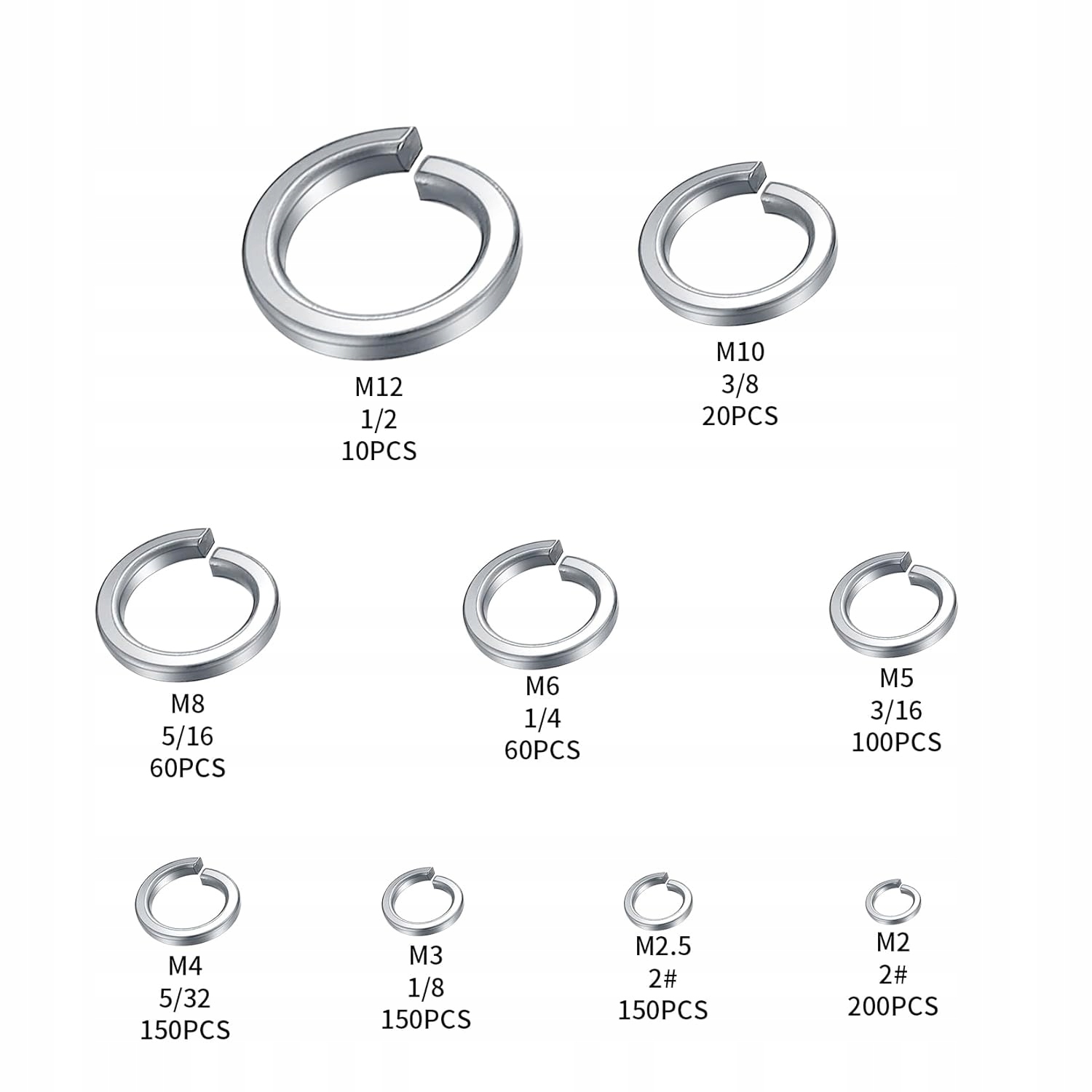 Zestaw obejmuje podkładki w 9 różnych rozmiarach: M2, M2.5, M3, M4, M5, M6, M8, M10 oraz M12. Dzięki tej różnorodności bez problemu dobierzesz odpowiedni rozmiar do swoich potrzeb, niezależnie od rodzaju projektu.