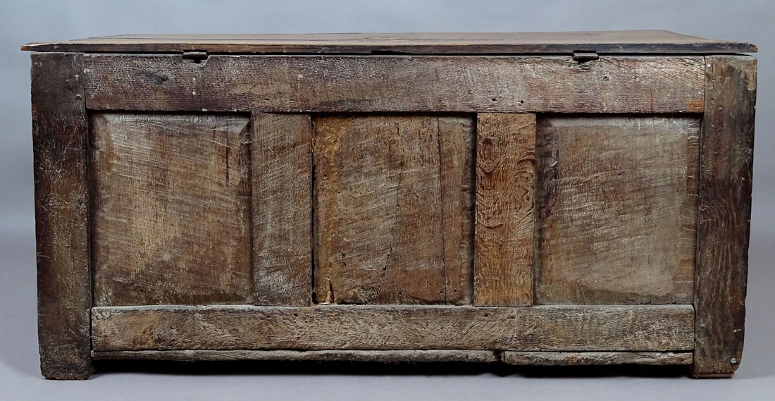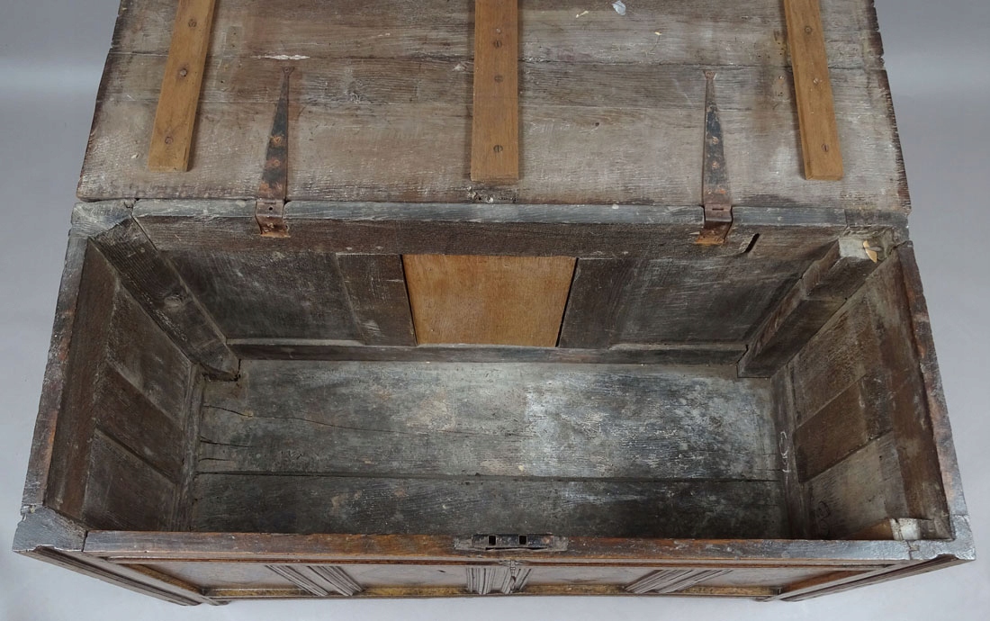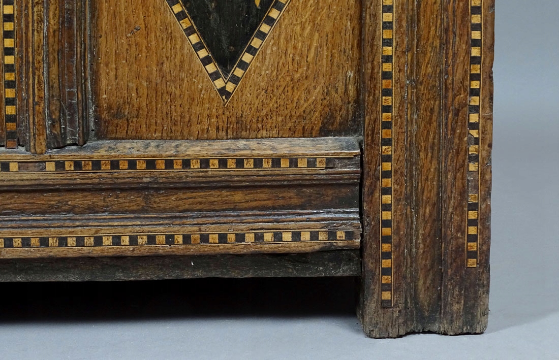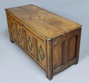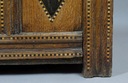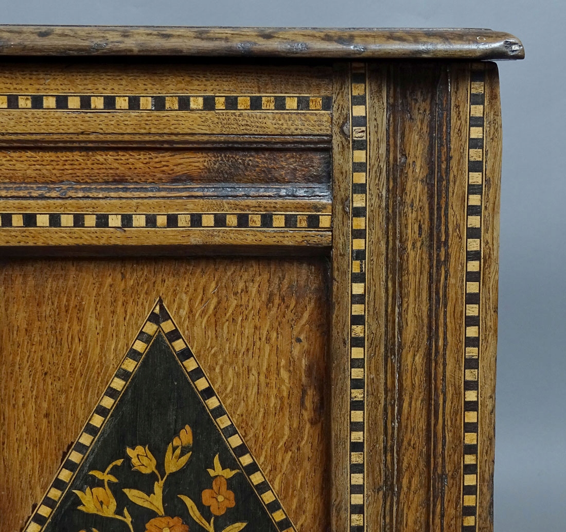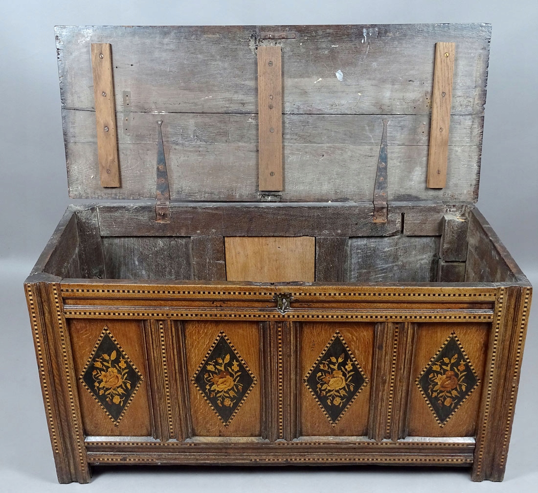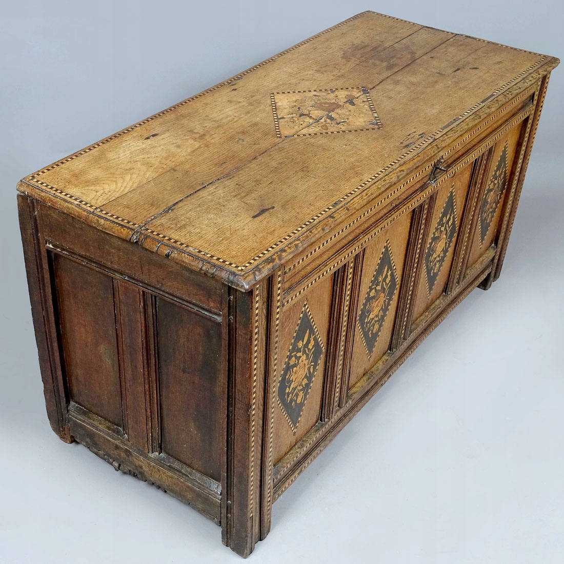 o prostych kształtach, zamykany wiekiem zamontowanym na dwóch stalowych, kutych zawiasach, wsparty na czterech nogach, będących przedłużeniem konstrukcji mebla. Front kufra podzielony na cztery rezerwy i w każdej z nich intarsjowane bukiety kwiatowe umieszczone w rombach, ze skośnie ułożonymi małymi kwadratami i dwoma żyłkami na obwodzie. Pomiędzy nimi szerokie, profilowane listwy, także intarsjowane. Wieko delikatnie wystające poza obrys kufra, z obfitym, intarsjowanym bukietem kwiatów tylko na jasnym tle, a na obwodzie identyczny wzór jak na licu mebla. Wewnątrz nakładany, kuty stalowy zamek z kluczem i stalowy uchwyt w wieku, niesprawny.