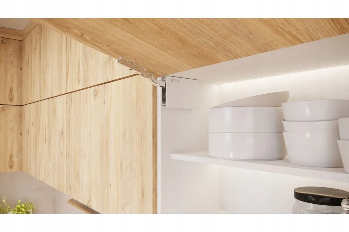 Podnośnik mechaniczny, który ułatwia zaprojektowanie funkcjonalnych oraz nowoczesnych szafek górnych. Zapewnia płynność ruchu oraz amortyzację przy zamykaniu szafek. Umożliwia zatrzymanie klapy w dowolnym położeniu zadanym przez użytkownika. Posiada aż 3 rodzaje regulacji: siły działania, czasu domknięcia oraz kąta otwarcia w przedziale 90° do 105°. Podnośnik znajdzie swoje zastosowanie w klapach o wysokości od 300 mm do 650 mm. Możliwość wyboru aż czterech wariantów siły sprężyny dostosowanych do wysokości i ciężaru frontu, umożliwia szeroki zakres zastosowania. Dostępne są 3 warianty kolorystyczne zaślepek: biały, antracyt oraz czarny. Prosty montaż, bez użycia dodatkowych szablonów czy pomiarów gdzie konstrukcja podnośnika jest jednocześnie jego szablonem montażowym.