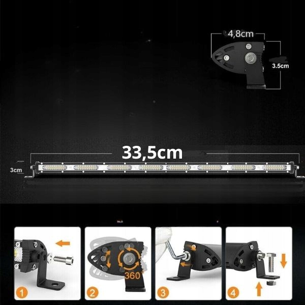 Lampa ma długość 33,5 cm, co umożliwia łatwą instalację na różnych pojazdach, a jej wytrzymała konstrukcja jest odporna na wstrząsy i wibracje typowe dla trudnych warunków terenowych. Obudowa lampy jest wodoodporna i pyłoszczelna, co gwarantuje jej niezawodność i długotrwałe użytkowanie nawet w najbardziej wymagających środowiskach. LED Bar jest wyposażony w zaawansowany system rozpraszania ciepła, który zapewnia długą żywotność diod LED i stabilność pracy.