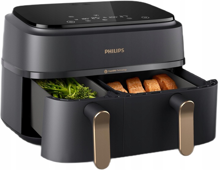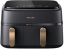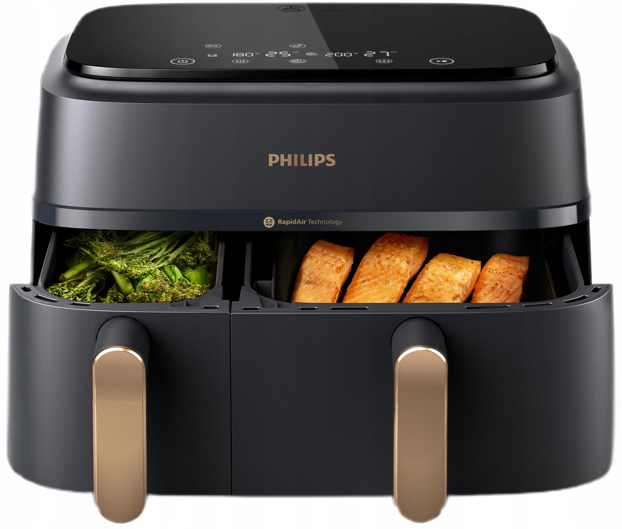 Frytkownica beztłuszczowa Philips Ovi Dual Basket umożliwia przygotowywanie posiłków tak, aby dwie potrawy były gorące i gotowe jednocześnie. Przyrządzaj smaczne i zdrowe posiłki dzięki dużej szufladzie, w której przygotujesz danie dla całej rodziny, oraz mniejszej, przeznaczonej na przystawki lub dania dla jednej osoby. Air fryer Philips pozwala na szybkie i wygodne gotowanie, które zadowoli całą rodzinę.