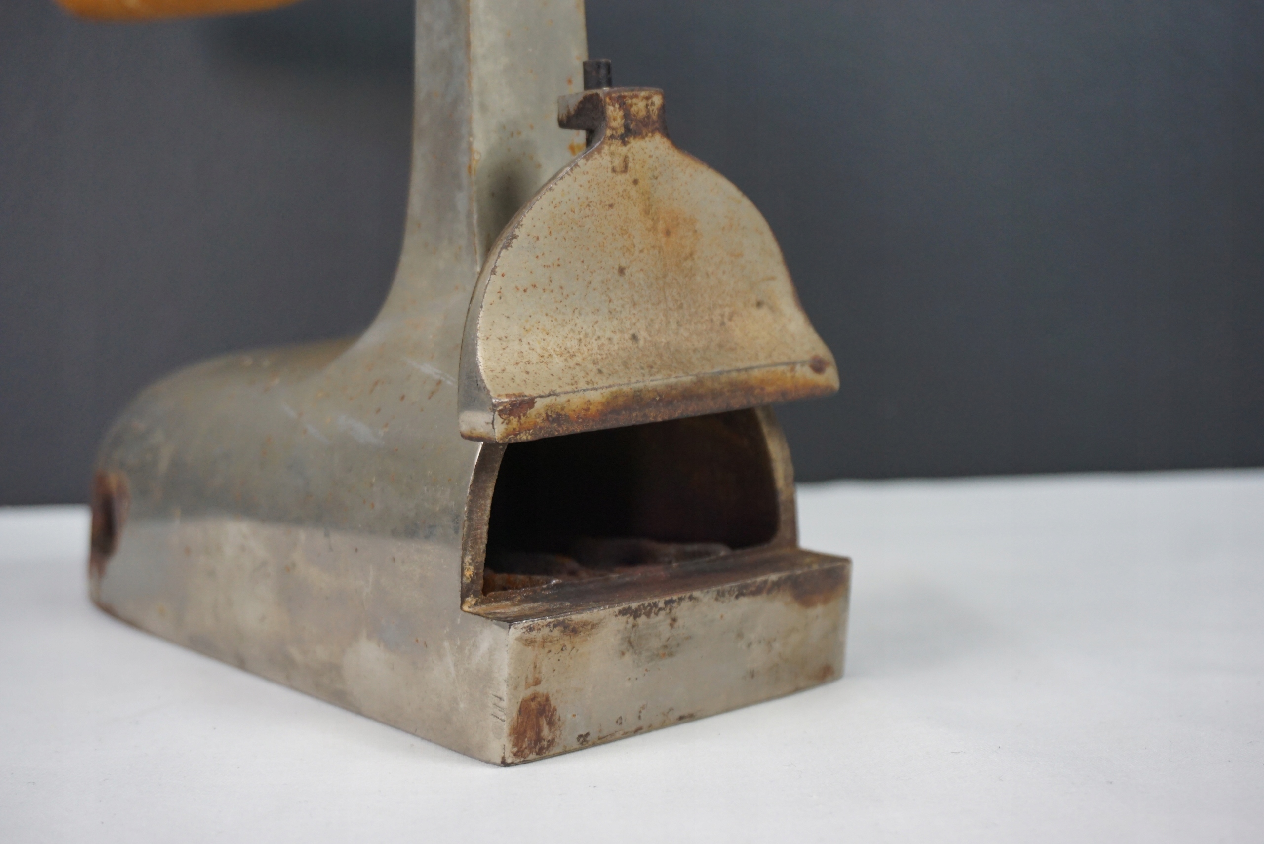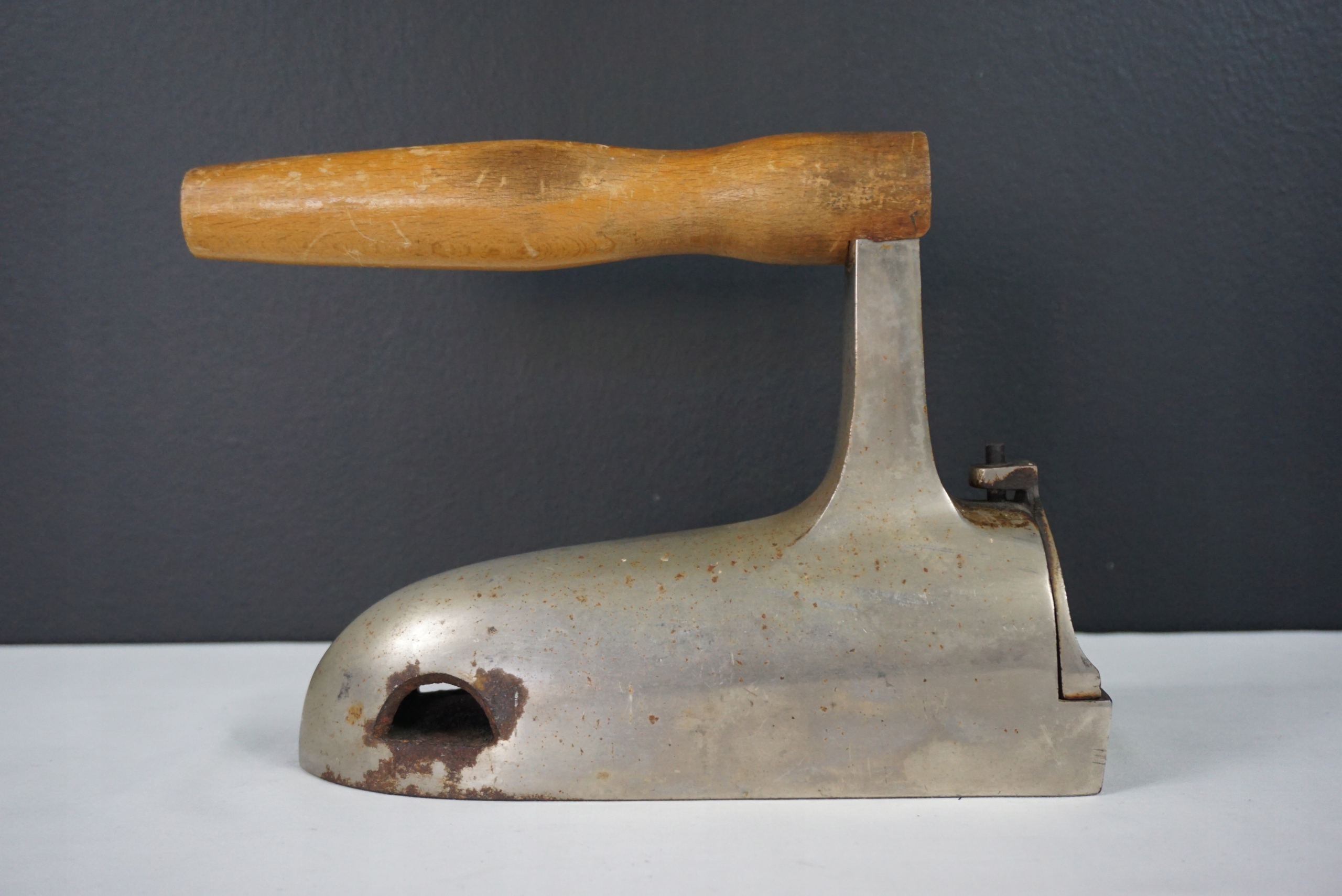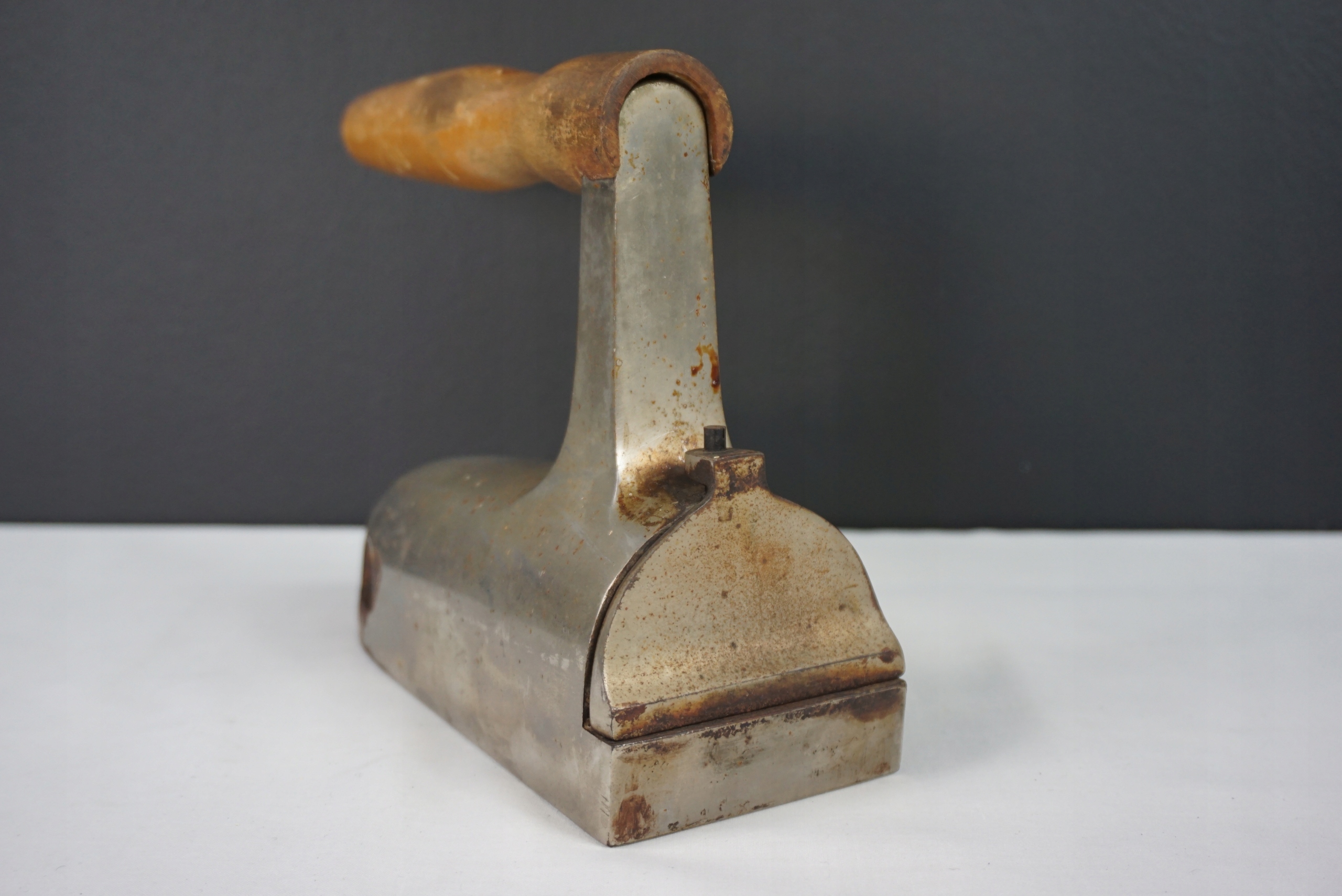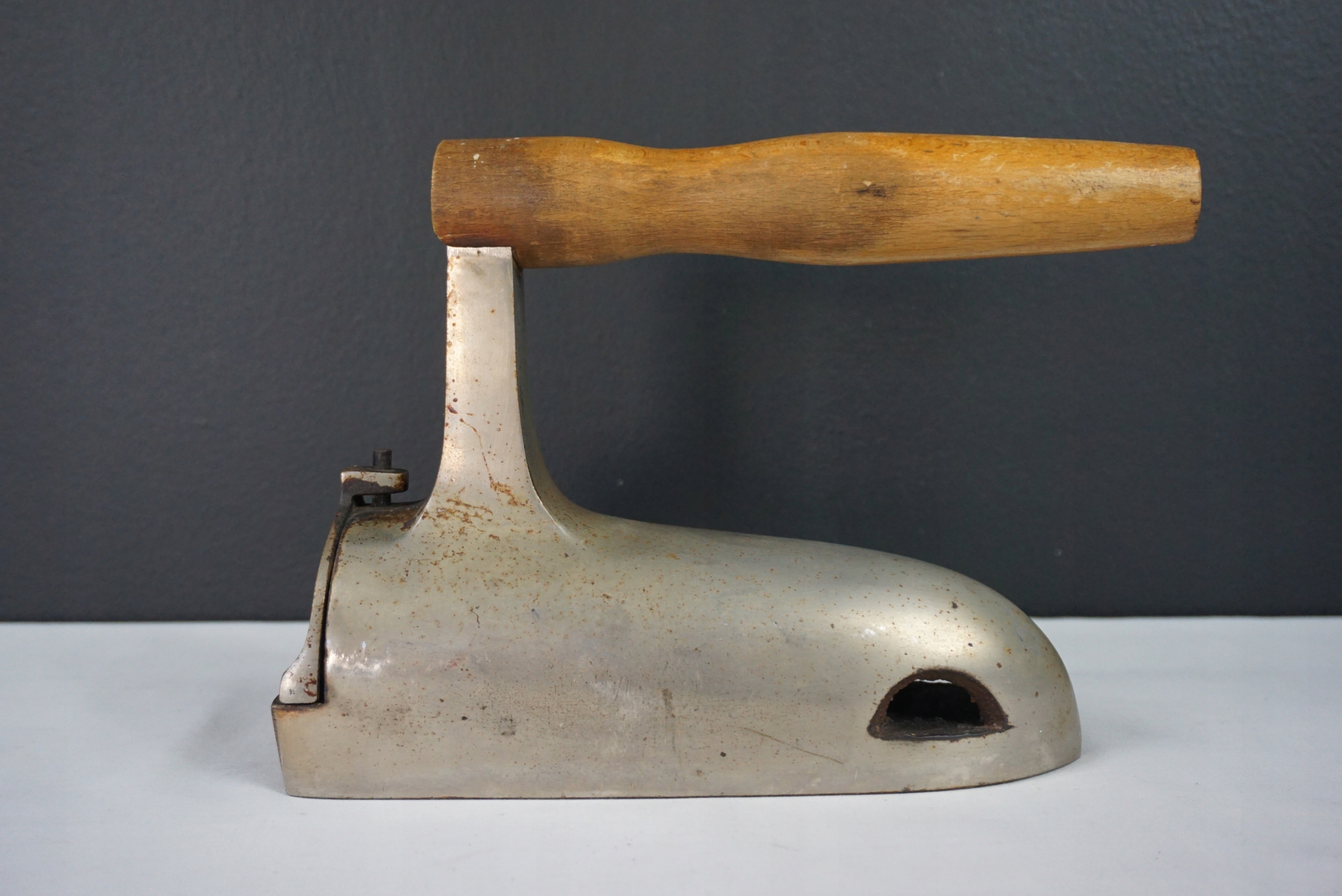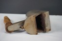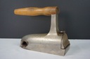 Przedwojenne żelazko gazowe - nagrzewane na specjalnym palniku. Oryginalna, drewniana rączka. Tylny dekiel sygnowany od środka 3-37. Przedmiot bez współczesnych ingerencji. Długość całkowita 25cm, szerokość 8cm, wysokość 17cm.