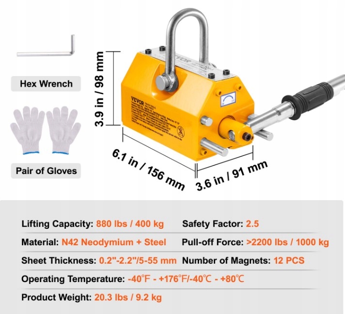 Nasz podnośnik z magnesami trwałymi może bez wysiłku podnosić ładunki o masie 400 kg. Składa się z potężnych magnesów neodymowych N42, które umożliwiają wydajne podnoszenie materiałów stalowych bez elektryczności na terenach przemysłowych.
