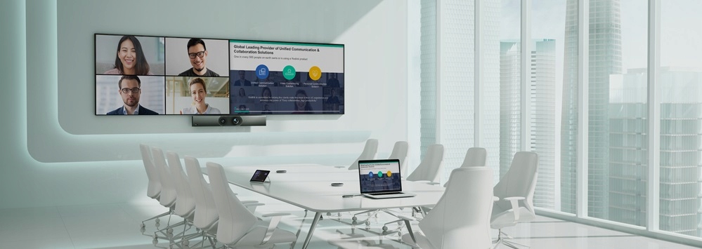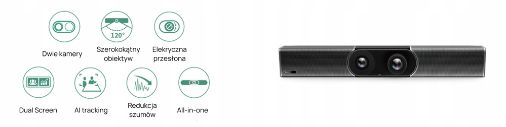 System kamer z podwójnym obiektywem obejmuje kamerę optyczną z 10-krotnym zoomem hybrydowym i kamerę 4K z polem widzenia 120, zapewniając wyraźne wrażenia wizualne. Wraz z elektryczną przesłoną zapewniającą prywatność, technologie AI, w tym automatyczne kadrowanie i śledzenie mówcy, pozwalają użytkownikom doświadczyć inteligentniejszej i bezpiecznej wideokonferencji.