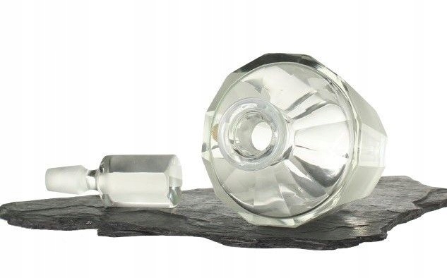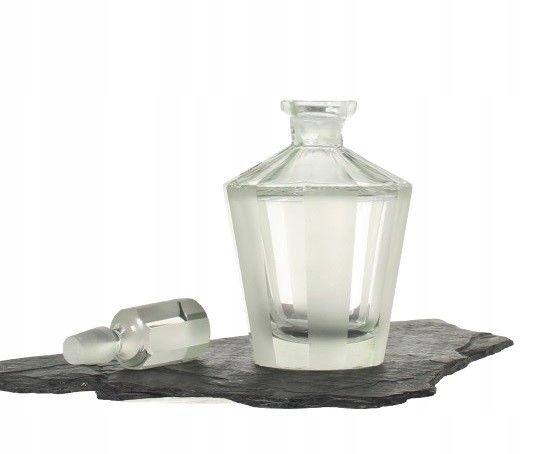Karafka wykonana z bezbarwnego szkła kryształowego. Brzusiec i korek zdobią szronione detale. Karafka pochodzi z Czechosłowacji – przypuszczalnie z wytwórni Ludwig Moser & Sons. Około I/IIpoł. XXw. Stylistyka art deco.