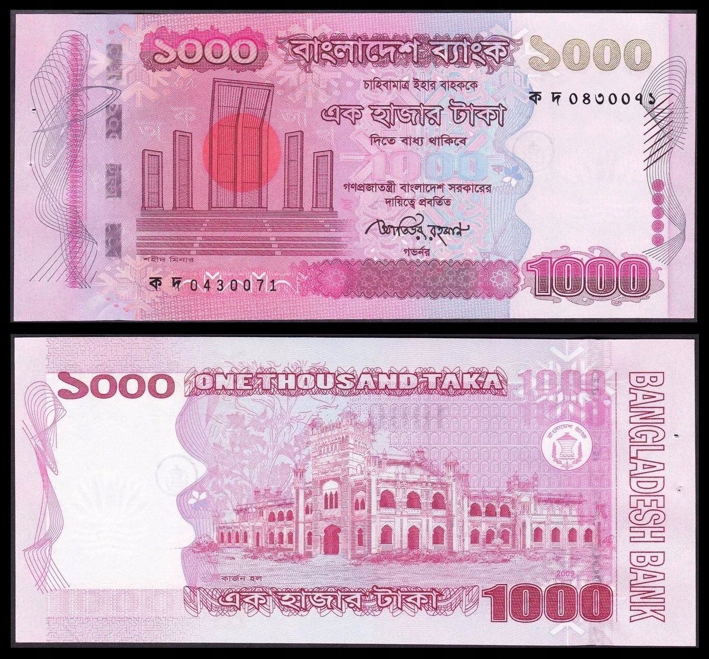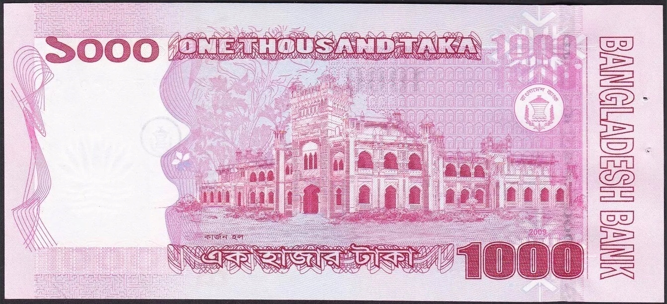 Przepiekny banknot 1000 Taka z Bangladesz - 2009r. (P51b) w stanie bankowym I (UNC) (ślad po zszywce bankowej).