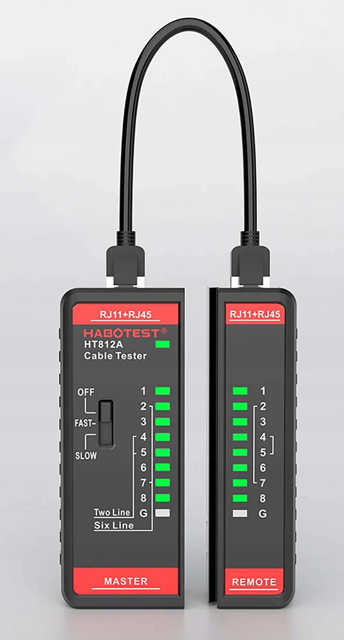 Z pomocą testera przewodów Habotest z powodzeniem uzyskasz informacje o działaniu kabli ze złączem RJ11 i RJ45. W łatwy sposób sprawdzisz wartości użytkowe przewodów telefonicznych i sieciowych. Urządzenie cechuje się kompaktową, rozkładaną konstrukcją. Czerpie zasilanie z 2 baterii AAA.
