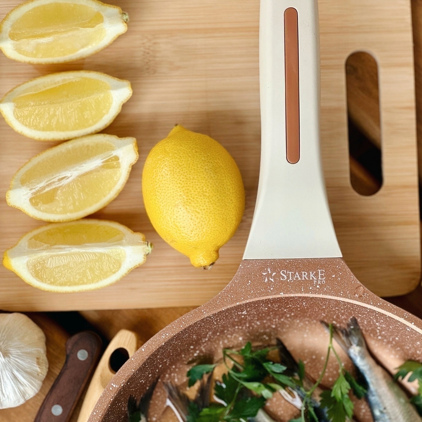 Średnia patelnia uniwersalna Starke Pro Texture Creamy 24 cm wykorzystuje powłokę non-stick ułatwiającą pielęgnację (nie do zmywarki, tylko mycie ręczne). Produkt jest solidny i pozwala na bezpieczne smażenie, zmniejszając ryzyko oparzenia dłoni. Ma również stylowy uchwyt soft touch, który się nie nagrzewa i nie ślizga w dłoni. Z patelnią nieprzywierającą Texture możesz tworzyć posiłki na każdym typie kuchenki. Elegancji dodaje jej marmurowa powłoka nieprzywierająca, która wytrzyma wiele cykli ścierania (8 000!) oraz wykończenie aluminiowego korpusu odlewanego i bardzo dobrze wyważonego. Nagrzewa się szybko, a więc oszczędzisz czas i energię. Świetnie sprawdzi się w rodzinnej kuchni lub jako prezent. Jest też dobrze zabezpieczona przed wysoką temperaturą i równomiernie przewodzi ciepło. Zapewnia pewny chwyt podczas przenoszenia. O jej bezpieczeństwie użytkowania oraz konstrukcji nietoksycznej dla środowiska stanowi oznaczenie PFOA Free. Ambasador marki i zawodowy szef kuchni, Piotr Kucharski, rekomenduje wybór właśnie tej patelni. W jego opinii popartej osobistymi testami zasługuje ona na najwyższą ocenę jakości i funkcjonalności. Patelnia indukcyjna Texture od marki Starke Pro objęta jest gwarancją niezawodności!
