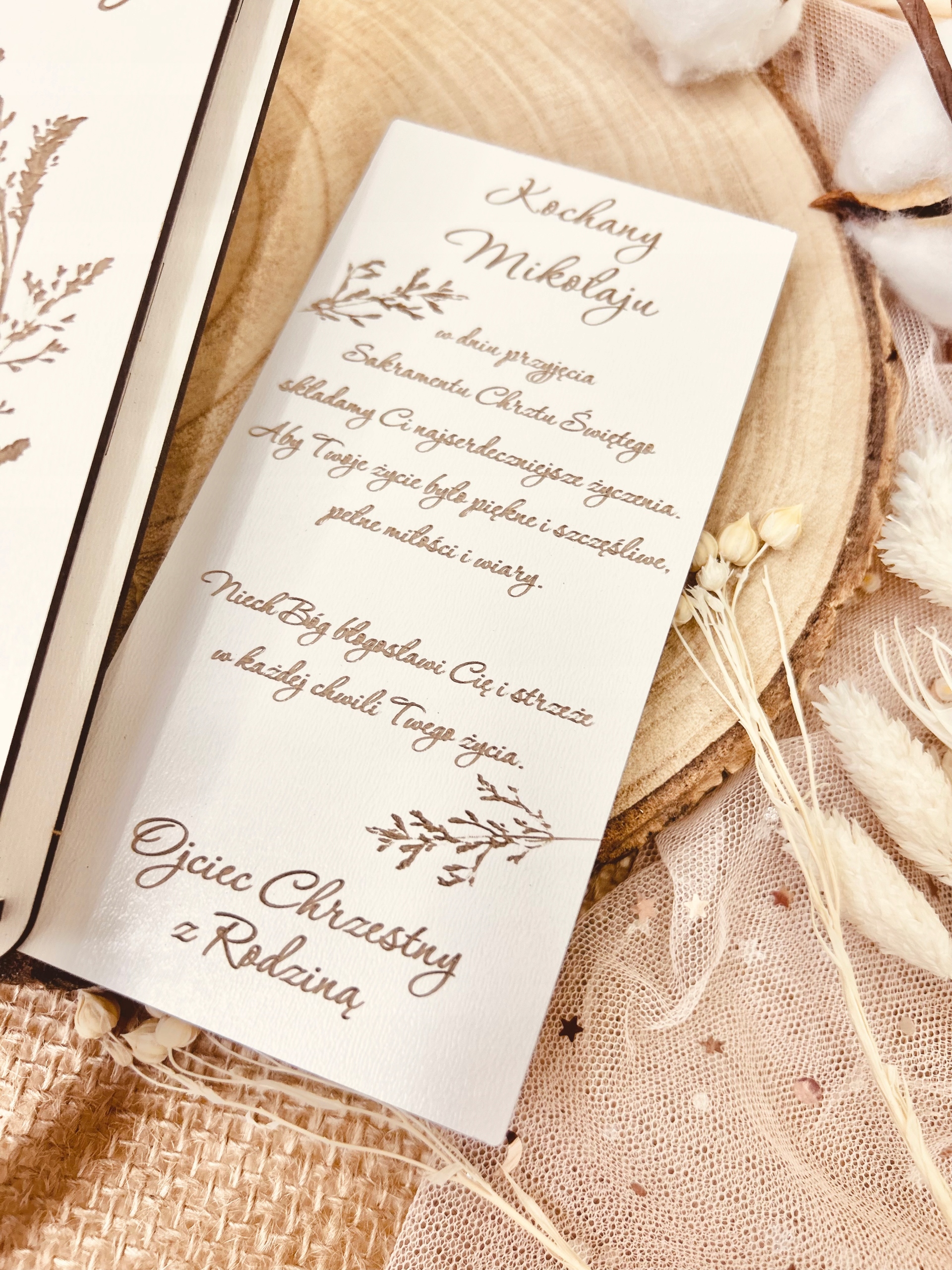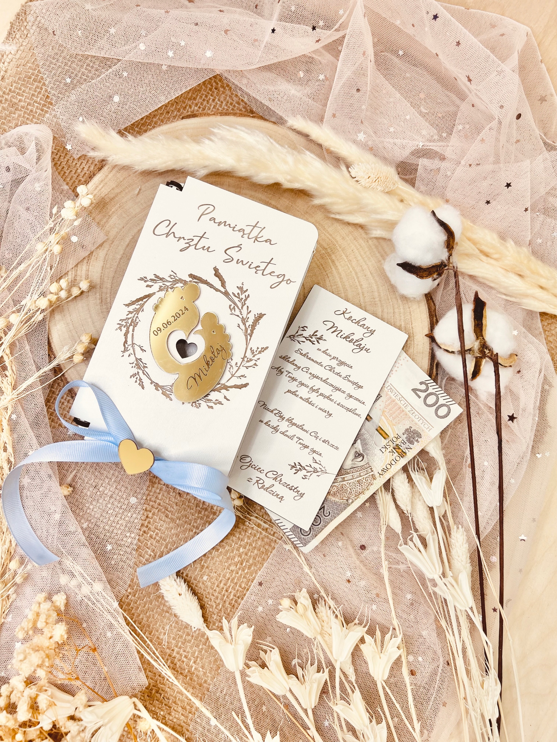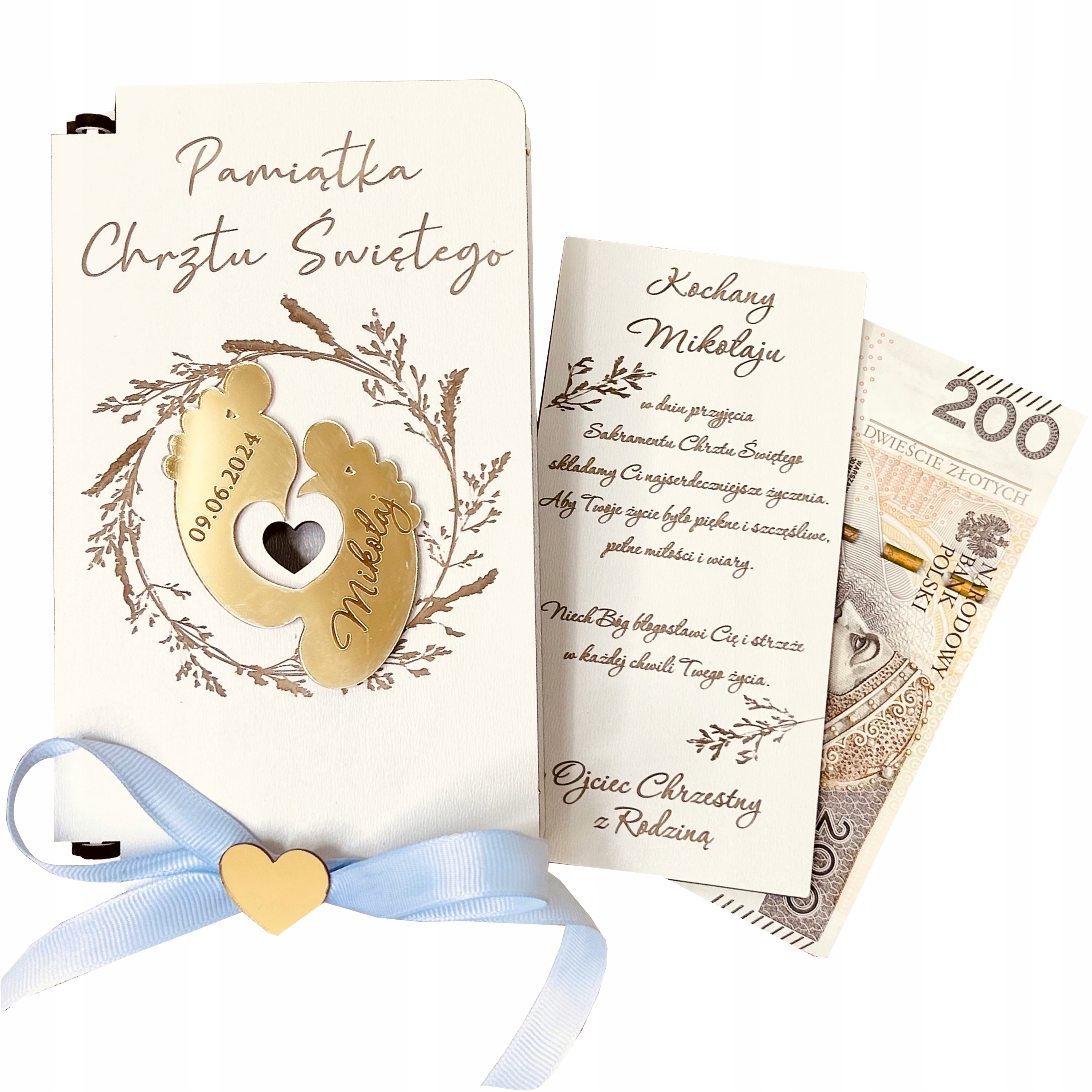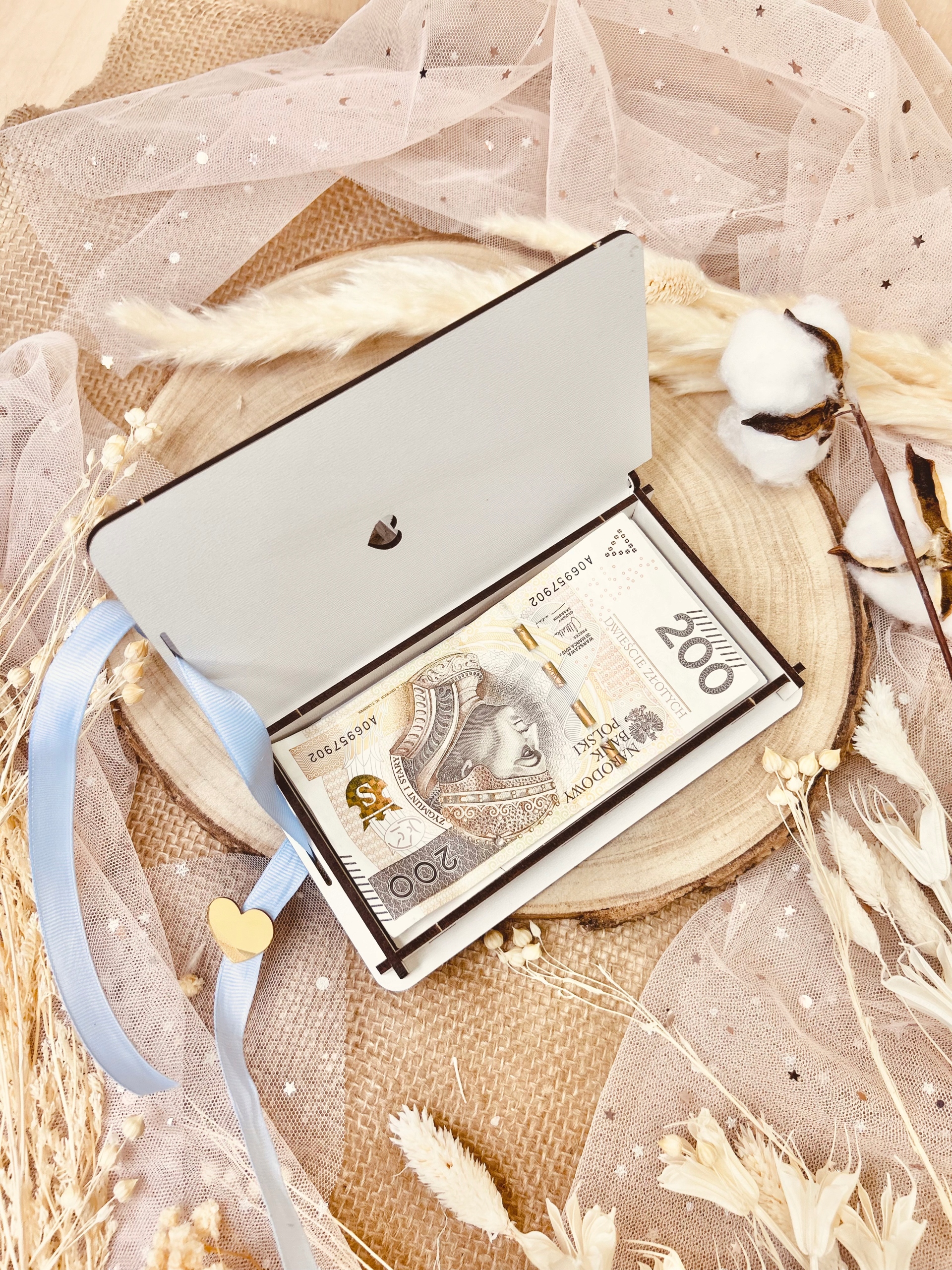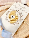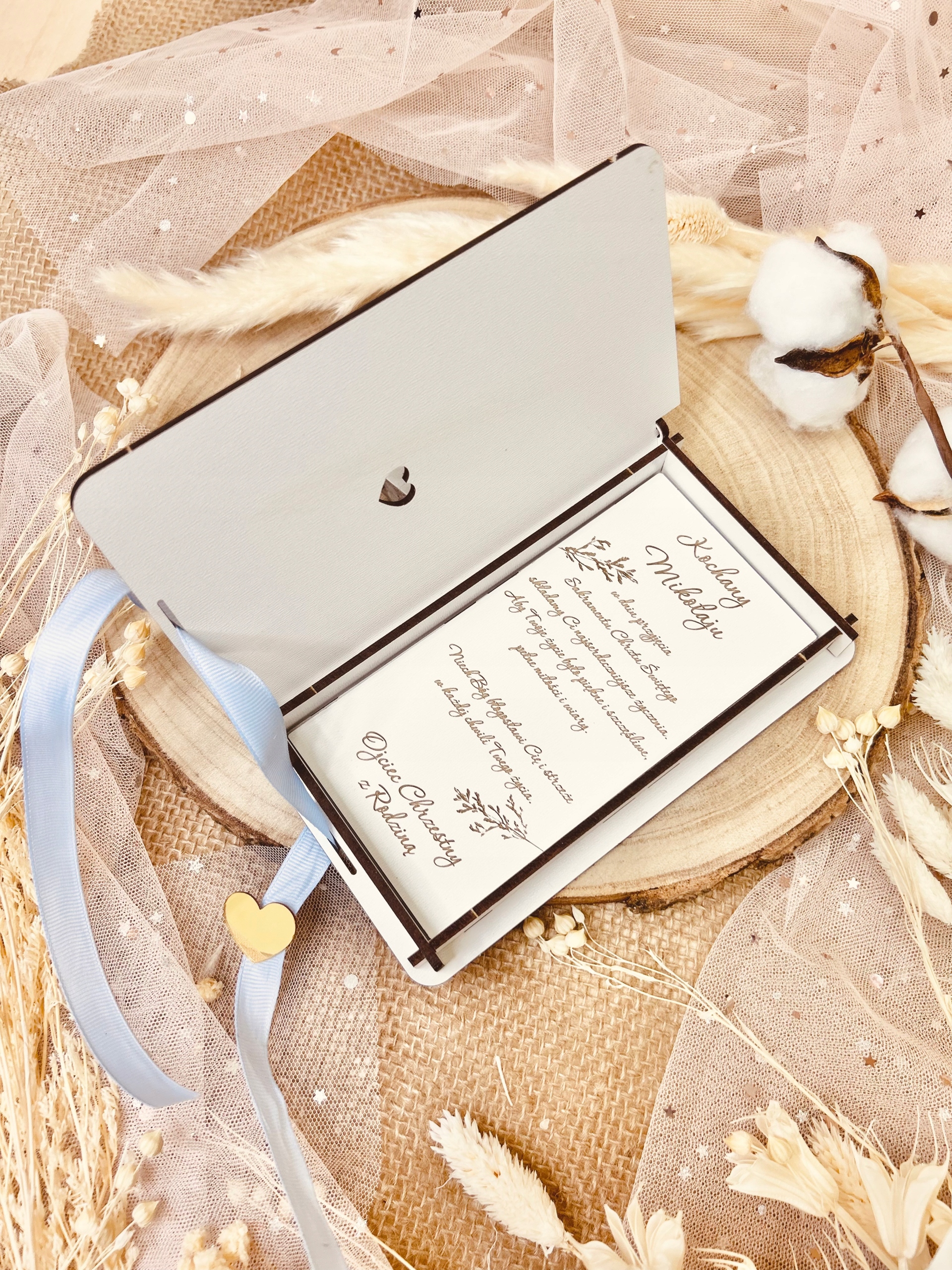 W pudełeczku znajdują się życzenia i podpis, które podlegają personalizacji. Do pudełeczka zmieszczą się banknoty i inne drobne upominki np. łańcuszek. Na zewnątrz pudełka grawerowane jest imię dziecka oraz data uroczystości.