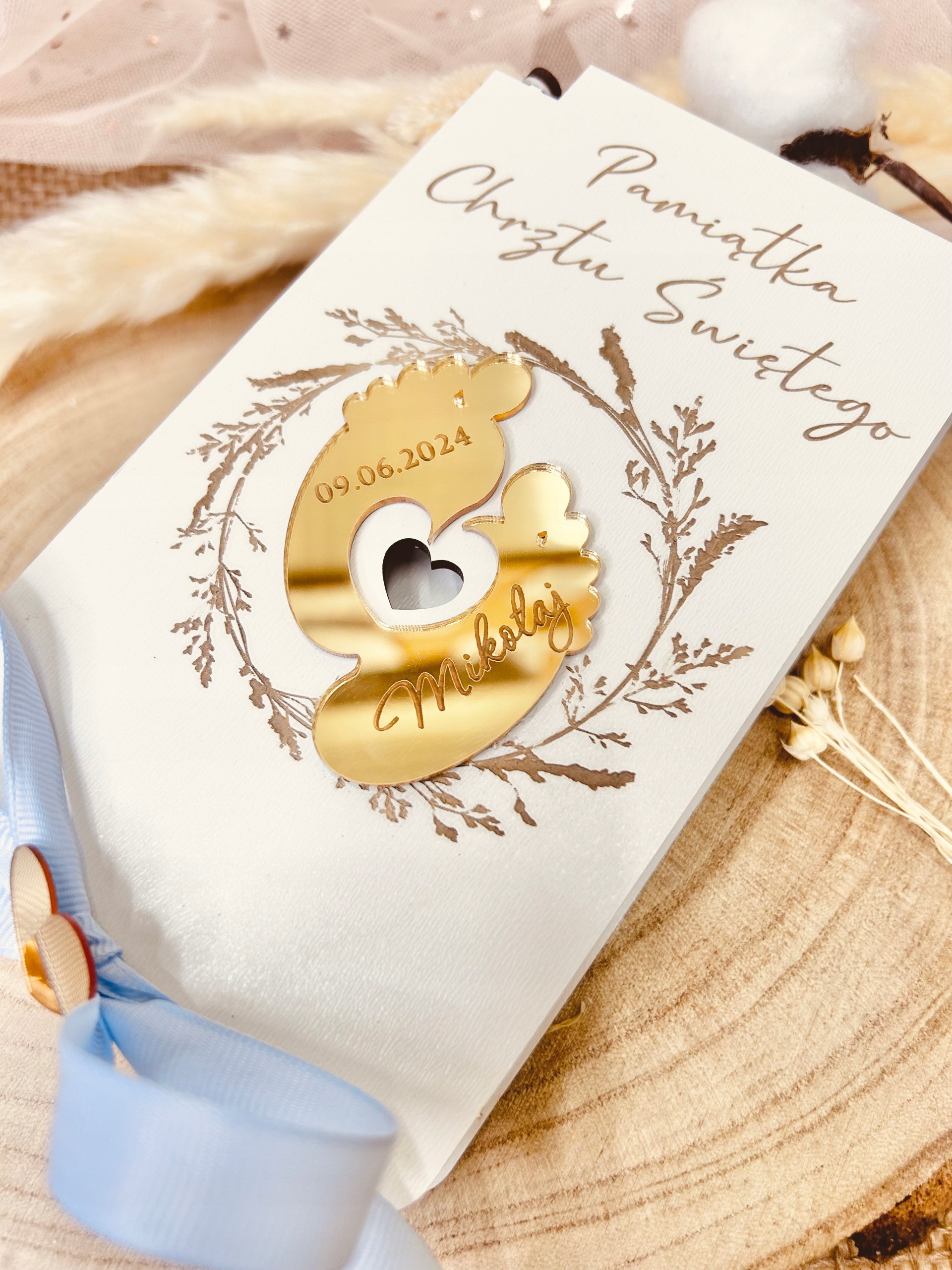 Pamiątka Chrztu Świętego w formie białego pudełka to unikalny pomysł na prezent. Produkt wykonany jest z białej płyty drewnopochodnej oraz złotego lustra akrylowego. Pamiątka przygotowywana jest na indywidualne zamówienie. Jest to wyjątkowy prezent oraz piękna pamiątka dla dziecka.