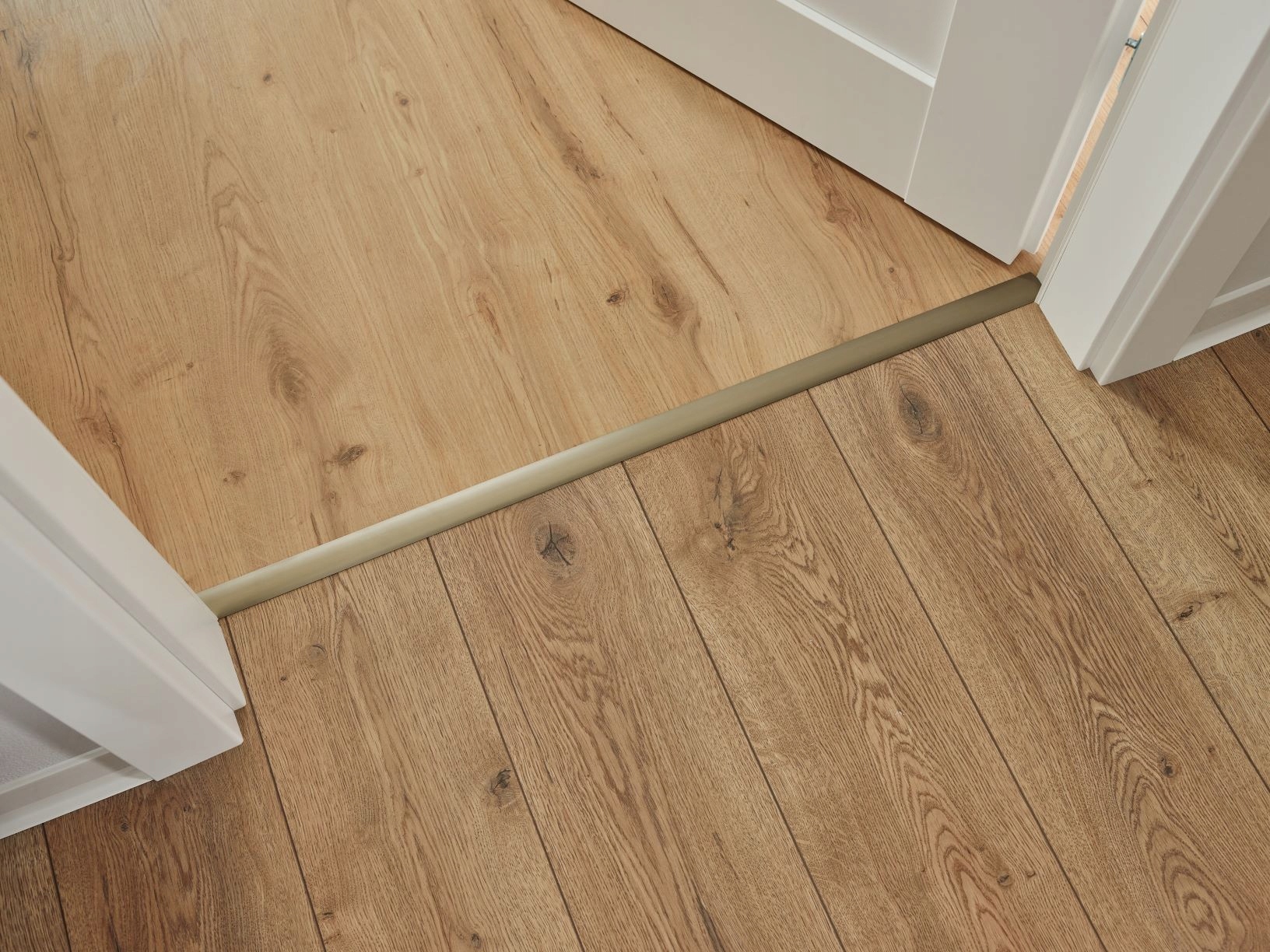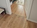 ✅ (Krok opcjonalny) Jeśli montujesz listwę na nierównym poziomie podłogi, użyj listwy niwelującej różnicę poziomów do 6 mm, aby uzyskać estetyczne wykończenie.