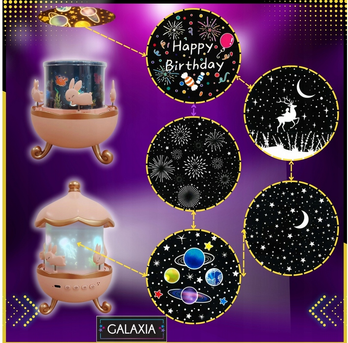 Urządzenie pełni funkcję zarówno projektora, jak i lampki nocnej. Wyświetla na ścianach i suficie urocze wzory, a także zapewnia miękkie, regulowane oświetlenie, tworząc ciepłą i przytulną atmosferę, idealną do zasypiania.