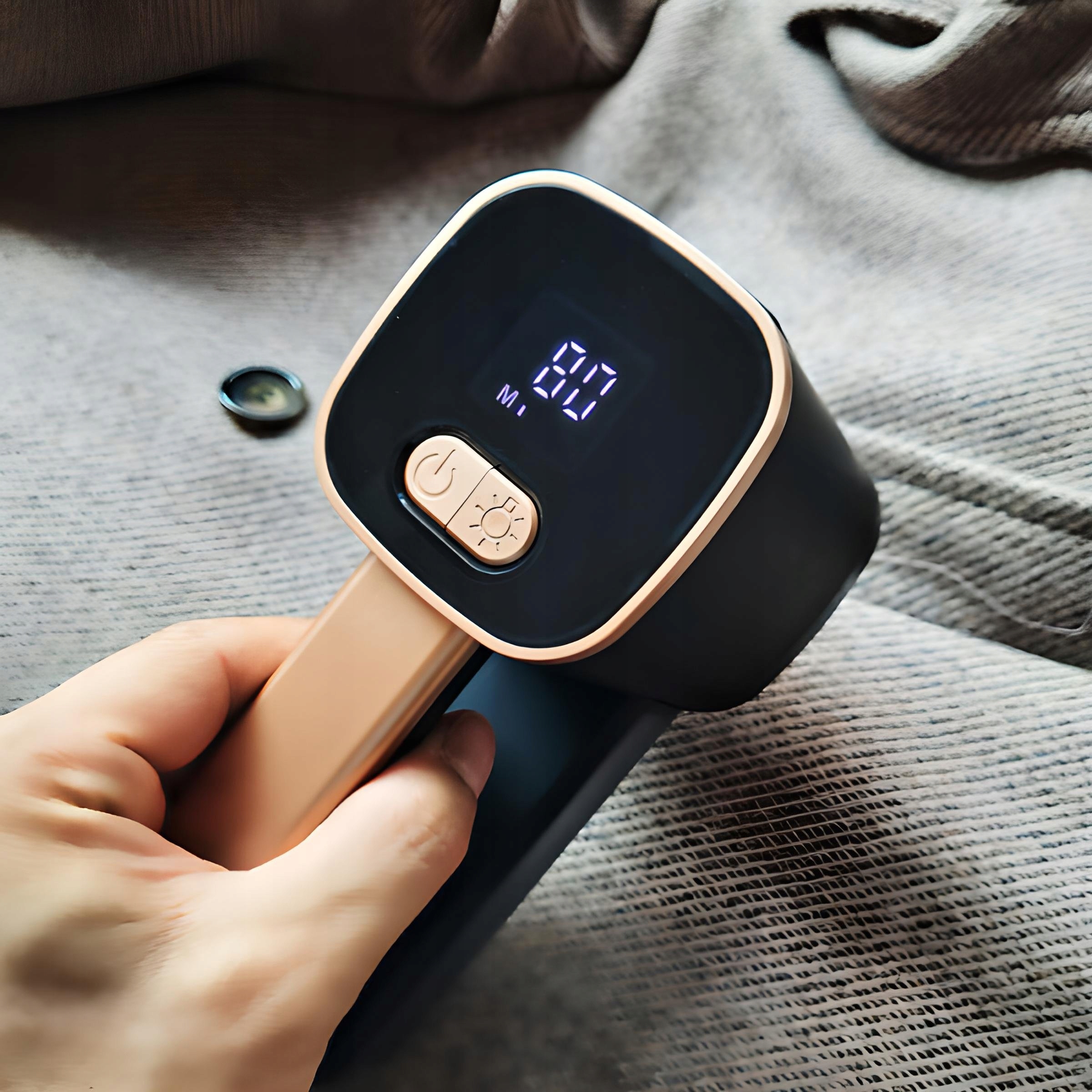 Duży i czytelny wyświetlacz LCD jest integralną częścią obudowy golarki elektrycznej do ubrań, co umożliwia użytkownikowi łatwe monitorowanie i kontrolowanie różnych parametrów urządzenia.
