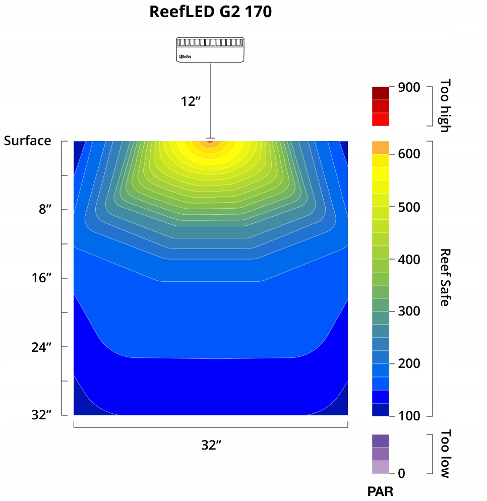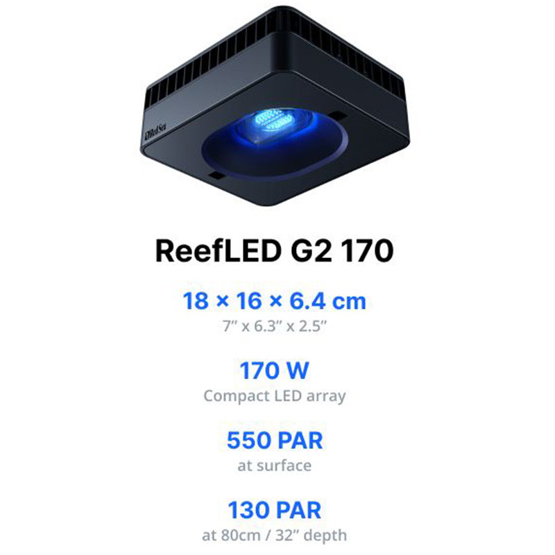 Odkryj ReefLED G2 170 – więcej mocy, mocniejszy blask i większe możliwości! Nowe modele wyposażone są w zupełnie nowy chipset w swoich kompaktowych matrycach, co pozwala uzyskać szersze spektrum światła. Można je regulować od 10 000K białego światła rafowego do 23 000K niebieskiego, działając przy pełnej intensywności – funkcja, której nie oferowała poprzednia generacja G1.