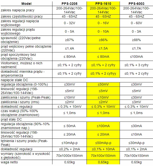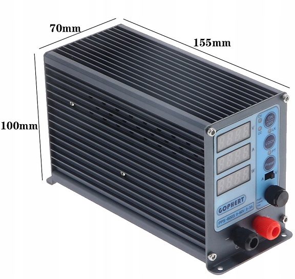 PPS-1610 produkcji Gophertc to zasilacz laboratoryjny o regulowanym napięciu wyjściowym DC w zakresie 0 do 16V i maksymalnym prądzie wyjściowym 10 Amper. Jest to konstrukcja impulsowa, a więc charakteryzująca się o wiele większą sprawnością w stosunku do klasycznych rozwiązań liniowych zasilaczy laboratoryjnych opartych na transformatorze. Dzięki temu mamy do dyspozycji pełnowartościowy zasilacz laboratoryjny o kompaktowych wymiarach i lekkiej konstrukcji. Cała elektronika zasilacza jest zamknięta w aluminiowej obudowie, która ogranicza przedostawanie się szumów i zakłóceń EMI na zewnątrz. Pracą zasilacza steruje mikroprocesor MCU. Z tyłu zasilacza PPS1610 mamy włącznik główny zasilania. Na panelu przednim zasilacza umieszczono trzy wyświetlacze woltomierz do pomiaru napięcia, amperomierz do pomiar prądu, oraz watomierz do pomiaru mocy wyjściowej. Zasilacz jest bardzo łatwy w obsłudze.