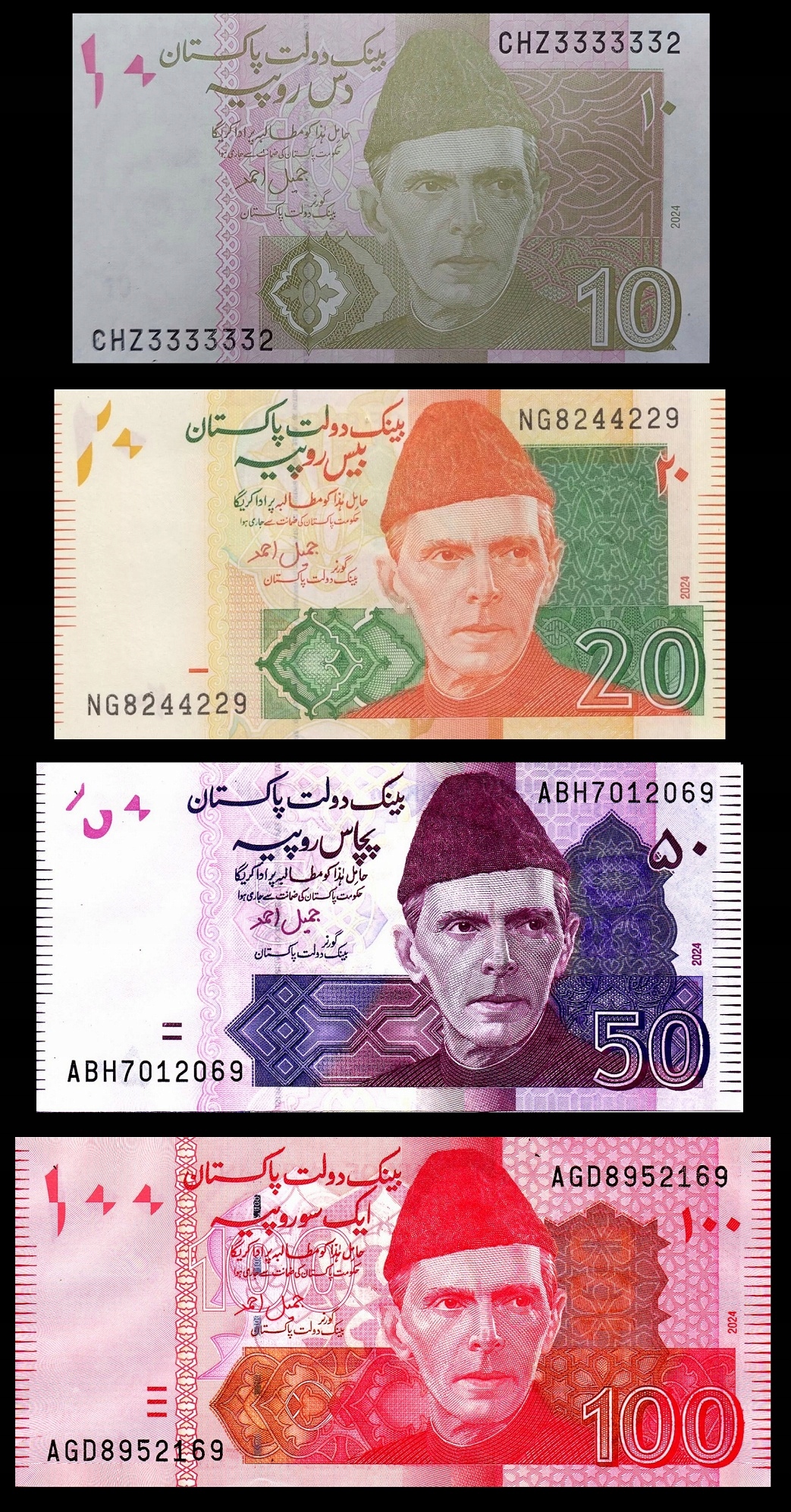 Piekny zestaw banknot z Pakistan - 2024r. w absolutnie doskonalym stanie bankowym I (UNC) z nastepujacymi nominalam: