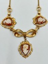 Przedmiotem sprzedaży jest śliczny naszyjnik z potrójną kameą wykonana w stylu wiktoriańskim, zdobiony kameą w kształcie serca z motywem profilowego popiersia młodej kobiety. Metal.