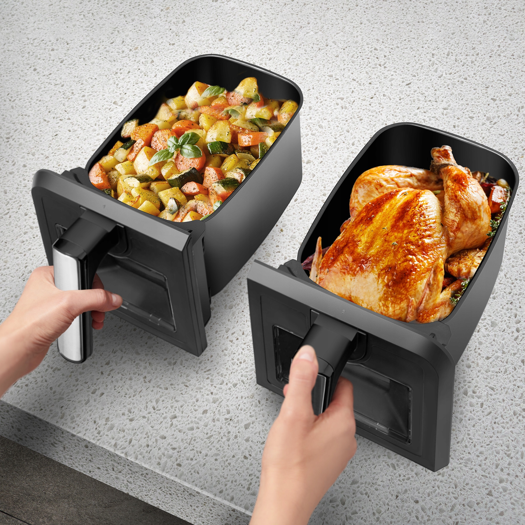 Frytownica powietrzna Samurai to kolejny poziom wygodnego gotowania. Dzięki dwóm komorom XXL, każda o pojemności 4 litrów, możesz przygotowywać różne potrawy w tym samym czasie. Niezależnie od tego, czy wolisz chrupiące frytki, soczyste mięso z grilla czy delikatnie ugotowane warzywa - to urządzenie spełni wszystkie Twoje potrzeby kulinarne. Podwójne zastosowanie czyni go szczególnie wydajnym, ponieważ można gotować w różnych programach w tym samym czasie.