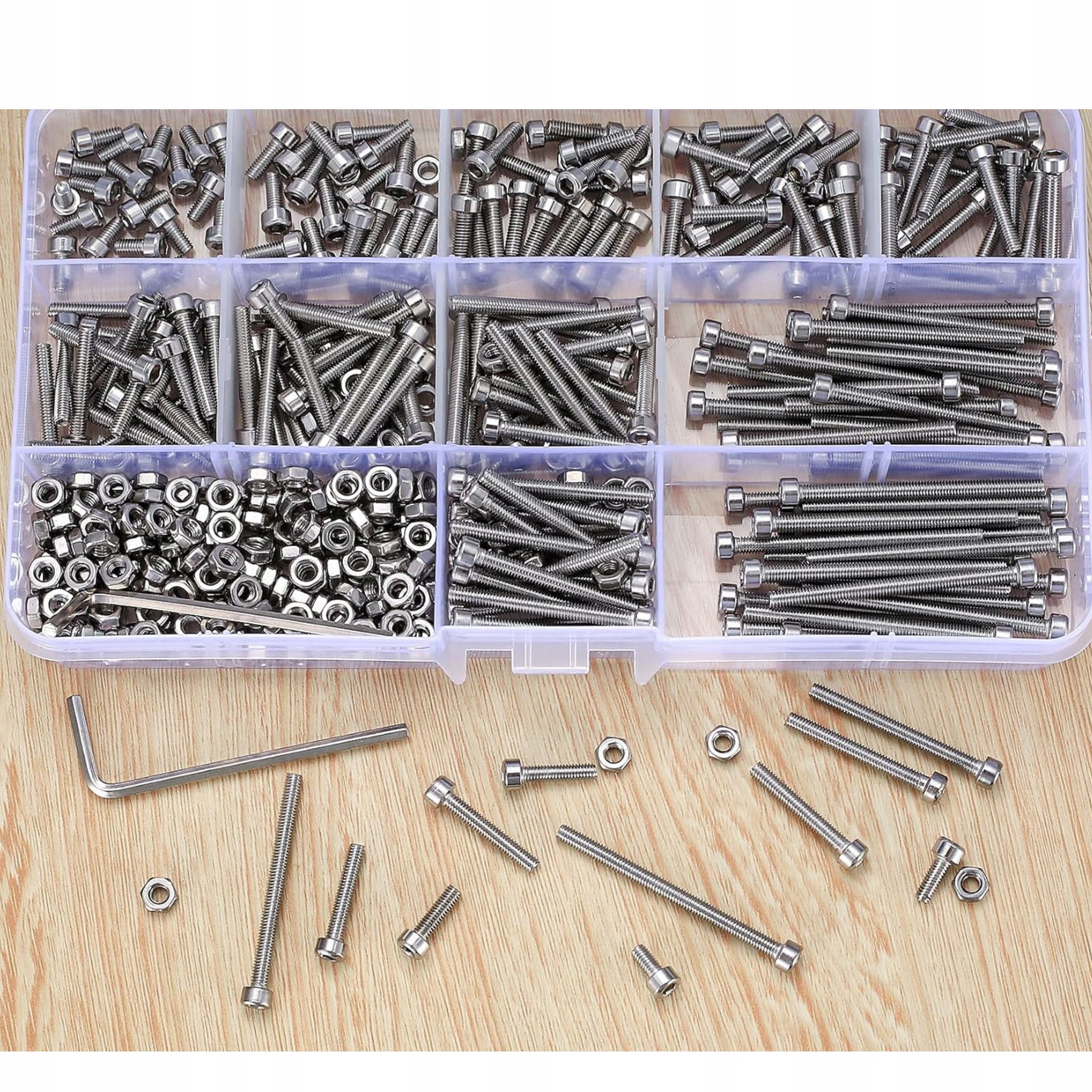 Zestaw dostarczany jest w solidnym, przezroczystym pojemniku z tworzywa sztucznego, co pozwala na łatwe przechowywanie i szybki dostęp do śrub i nakrętek. Dzięki temu Twoje miejsce pracy pozostaje zorganizowane, a wszystkie elementy są zawsze na wyciągnięcie ręki.