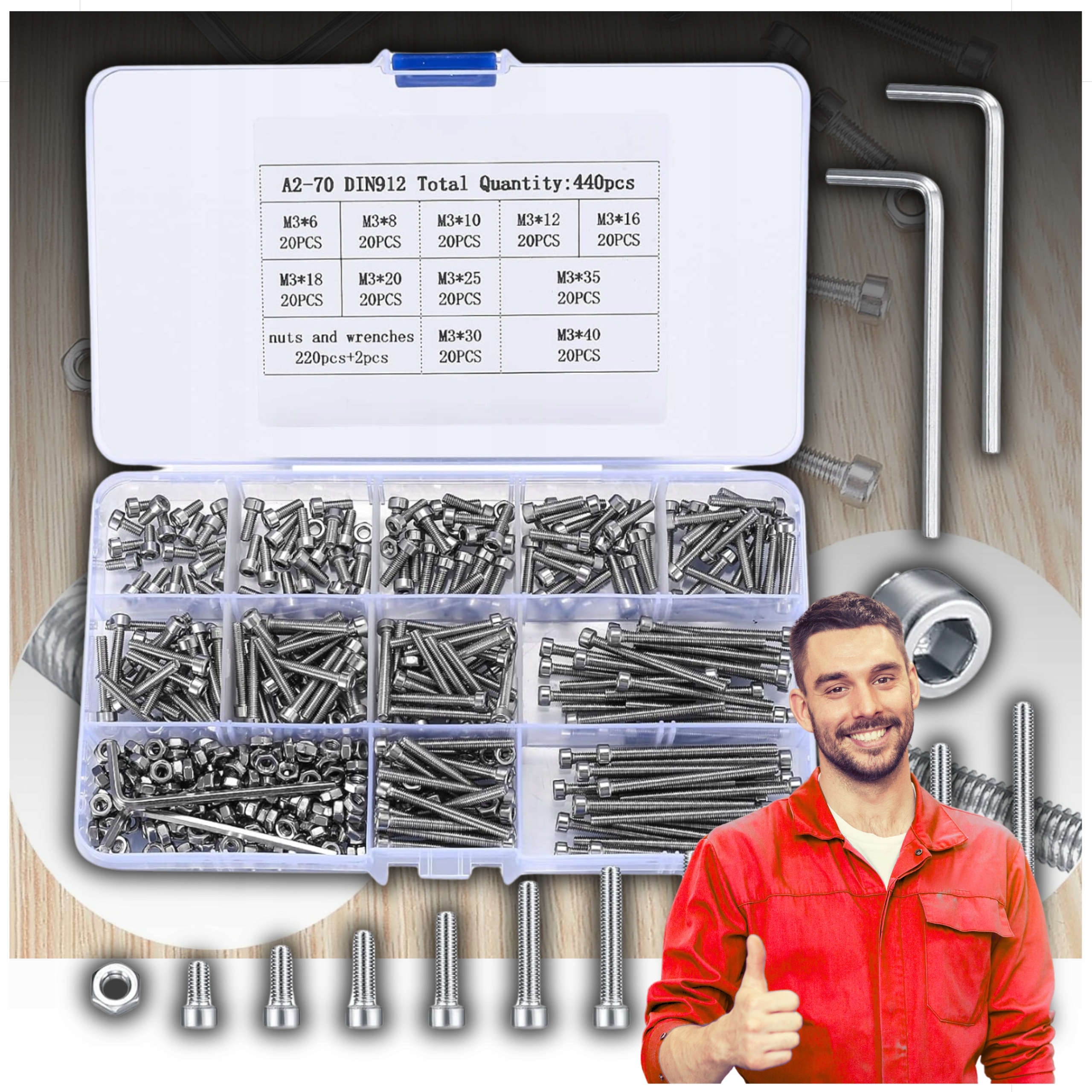 Kup Zestaw śrub M3 z nakrętkami (440 sztuk) u nas i zyskaj trwałe śruby ze stali nierdzewnej, odporne na korozję i rdzę. Precyzyjne, łatwe w użyciu, zapakowane w przezroczyste etui dla szybkiego dostępu. Idealne do projektów domowych, biurowych i montażowych. Wybierz nasz zestaw dla solidnych i długotrwałych rozwiązań!