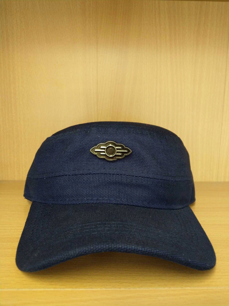 Czapka z metalowym logo na czole i napisem Fallout na karku w stylu denim.