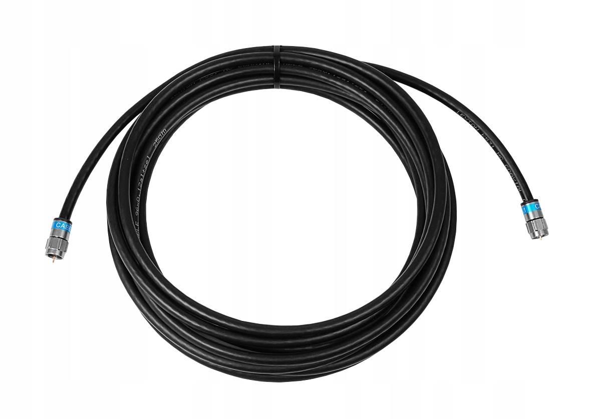 Całość składa się z kabla 10m w kolorze czarnym, oraz dwóch złącz typu F i beczki.