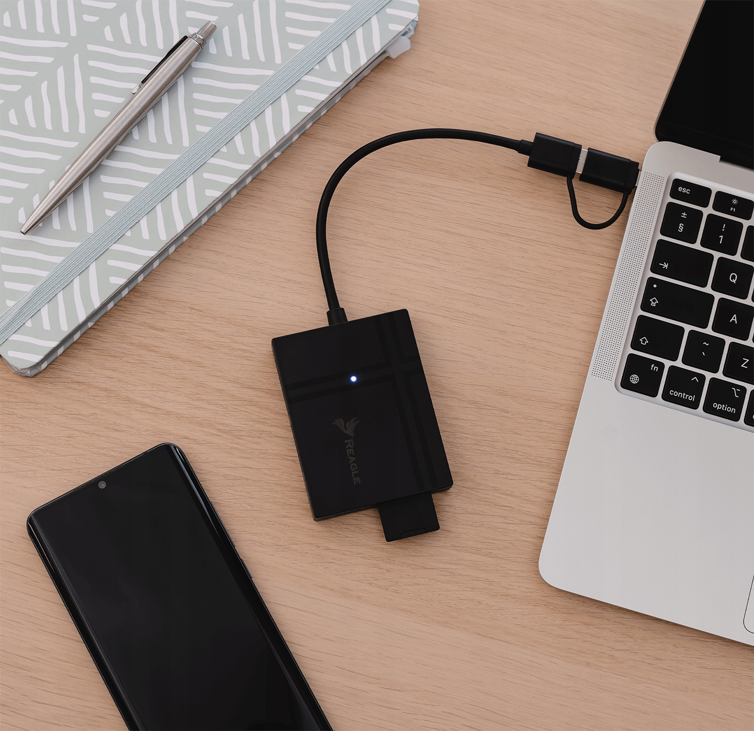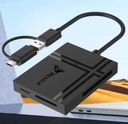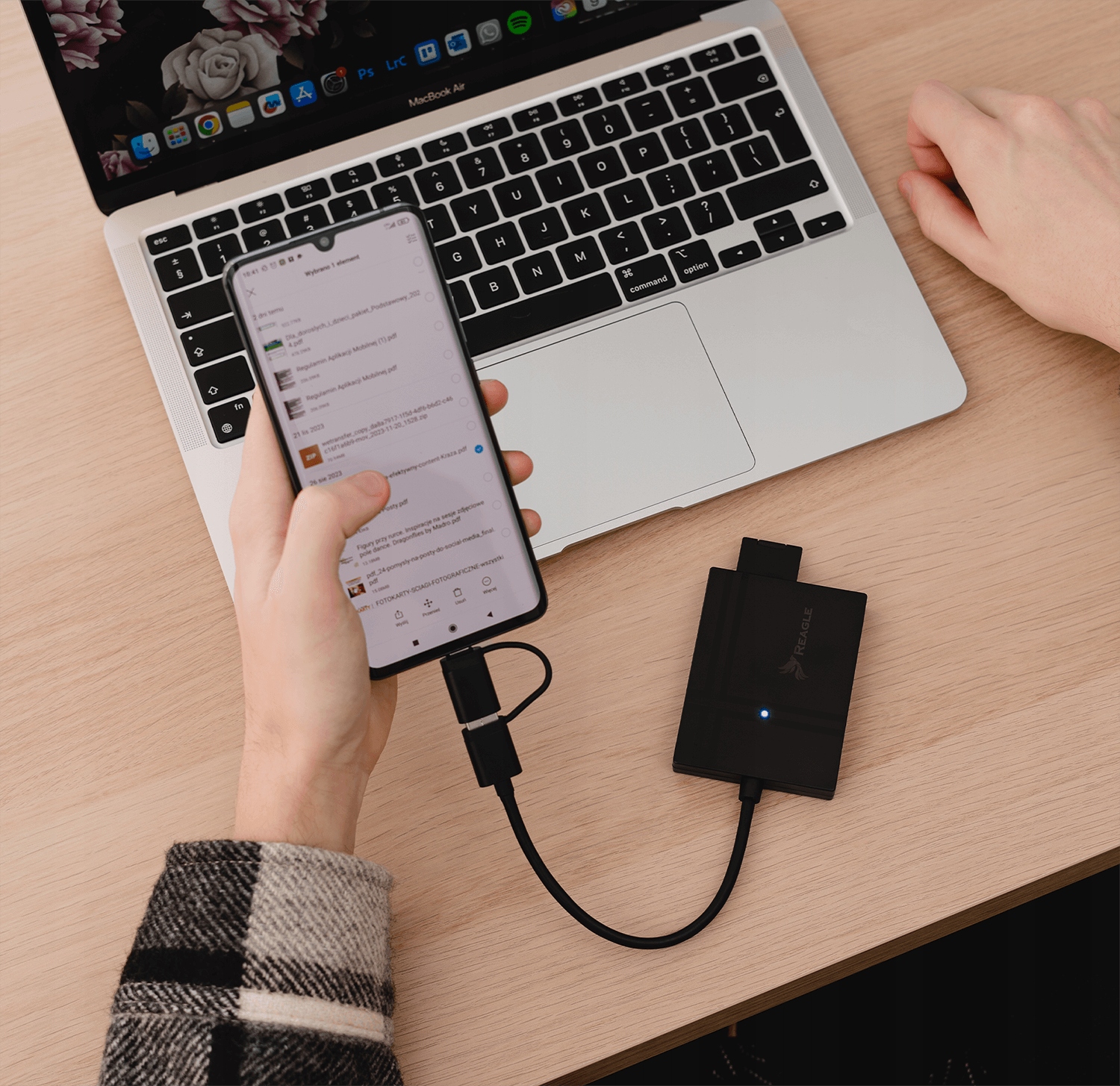 Wtyk 2w1 daje możliwość podłączenia czytnika do praktycznie każdego urządzenia, niezależnie od rodzaju portu USB, ponieważ posiada zarówno USB-A, jak i USB-C. Teraz już nie musisz martwić się o to, czy laptop lub smartfon posiada odpowiedni port - nasz czytnik obsłuży każde z tych urządzeń.