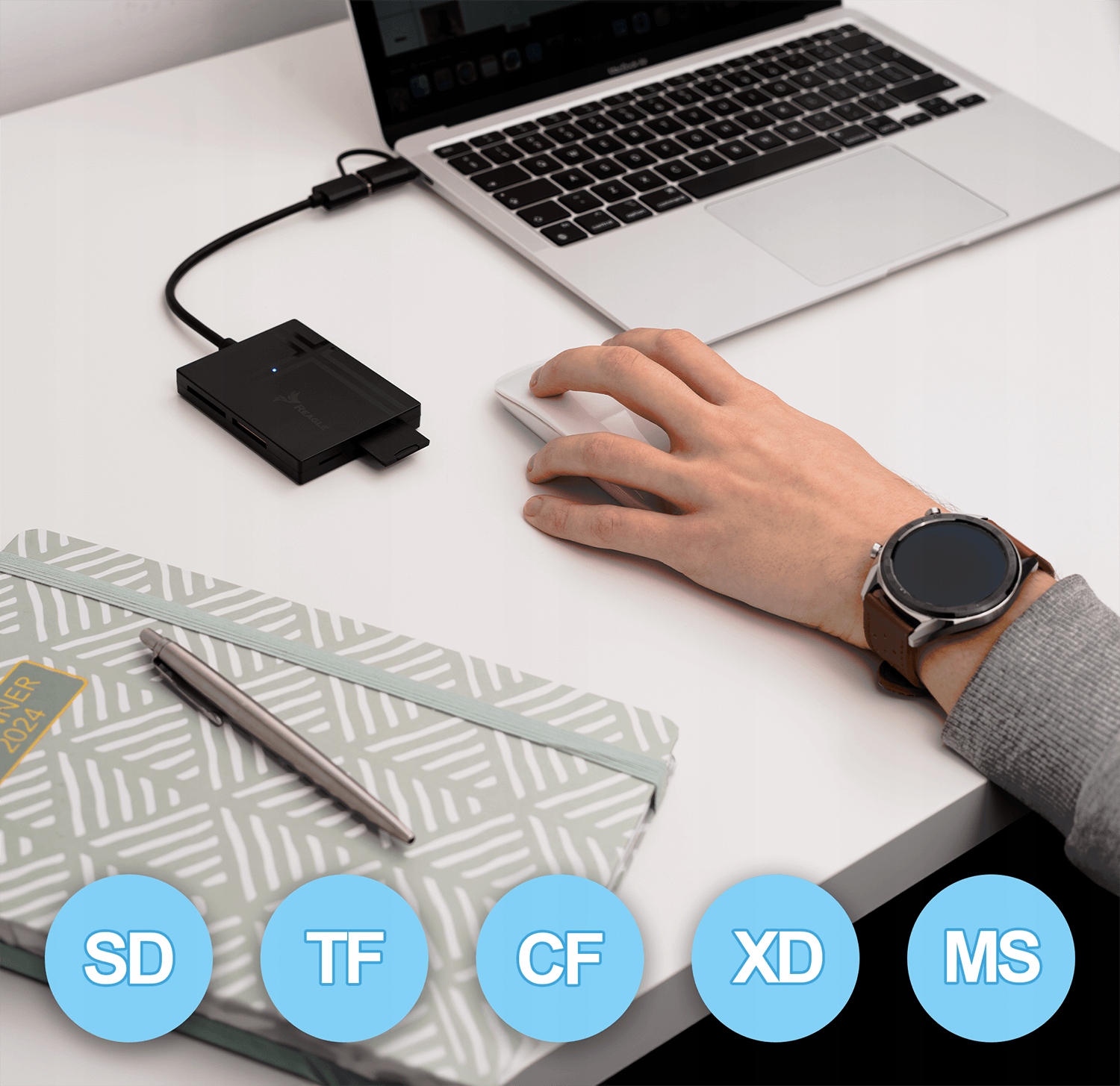 Czytnik jest utrzymany w eleganckim, minimalistycznym stylu. To idealne rozwiązanie dla osób, które cenią sobie nie tylko wydajność, ale także estetykę swoich akcesoriów. Doskonale wpisuje się w trendy nowoczesnej technologii, dzięki swojej kompatybilności i wszechstronności. Spełni wszystkie oczekiwania osób, które poszukują kompleksowego rozwiązania do obsługi kart pamięci.