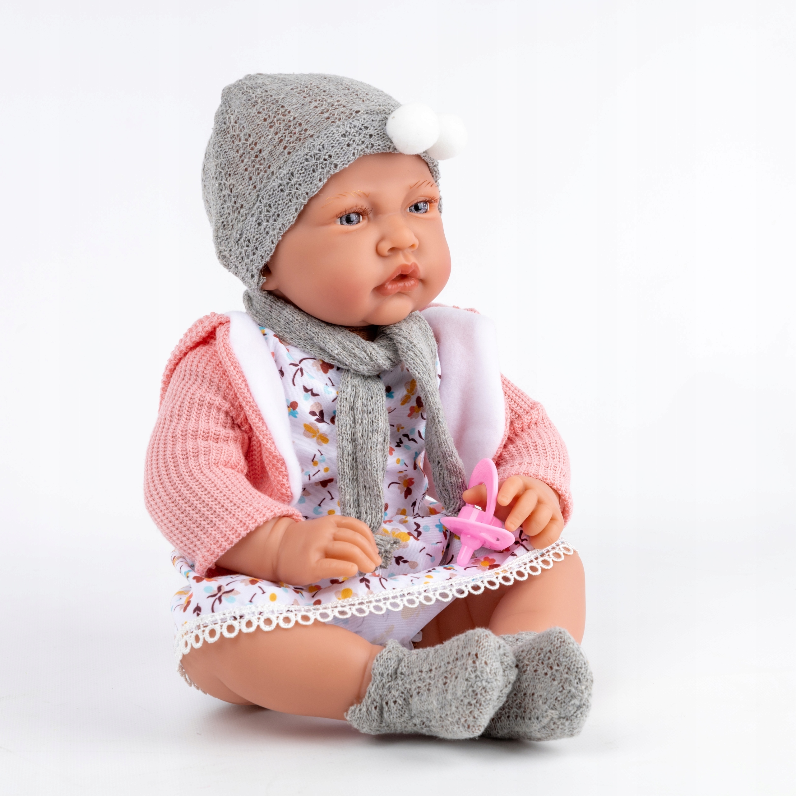 Pozwól swojemu dziecku odkrywać świat z naszą realistyczną lalką dziewczynką, która zachwyca nie tylko wyglądem, ale również miękkim, przyjaznym dotykiem. Ubrana w stylowy, kwiecisty strój, różowy sweterek i szary komplet zimowy (czapeczka, szalik i skarpetki), ta lalka stanie się wiernym towarzyszem dziecięcych zabaw.