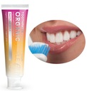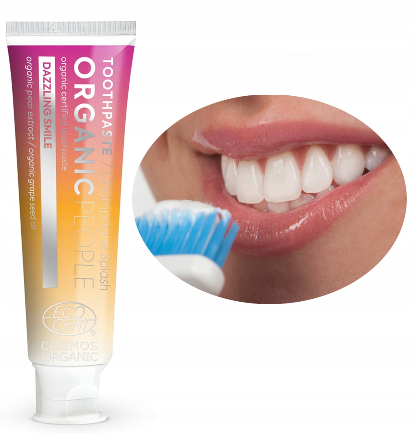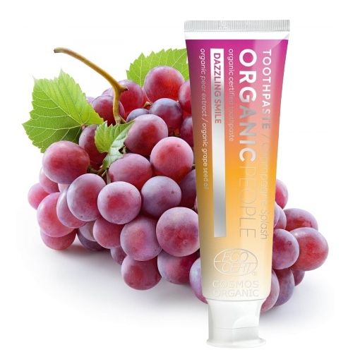 Certyfikowana pasta do zębów Organic People Champagne Splash - Piękny Uśmiech. Formuła pasty jest bez fluoru, oparta na naturalnych składnikach: ksylitol, organiczny ekstrakt z gruszki, organiczny olejek winogronowy i krzemionka.