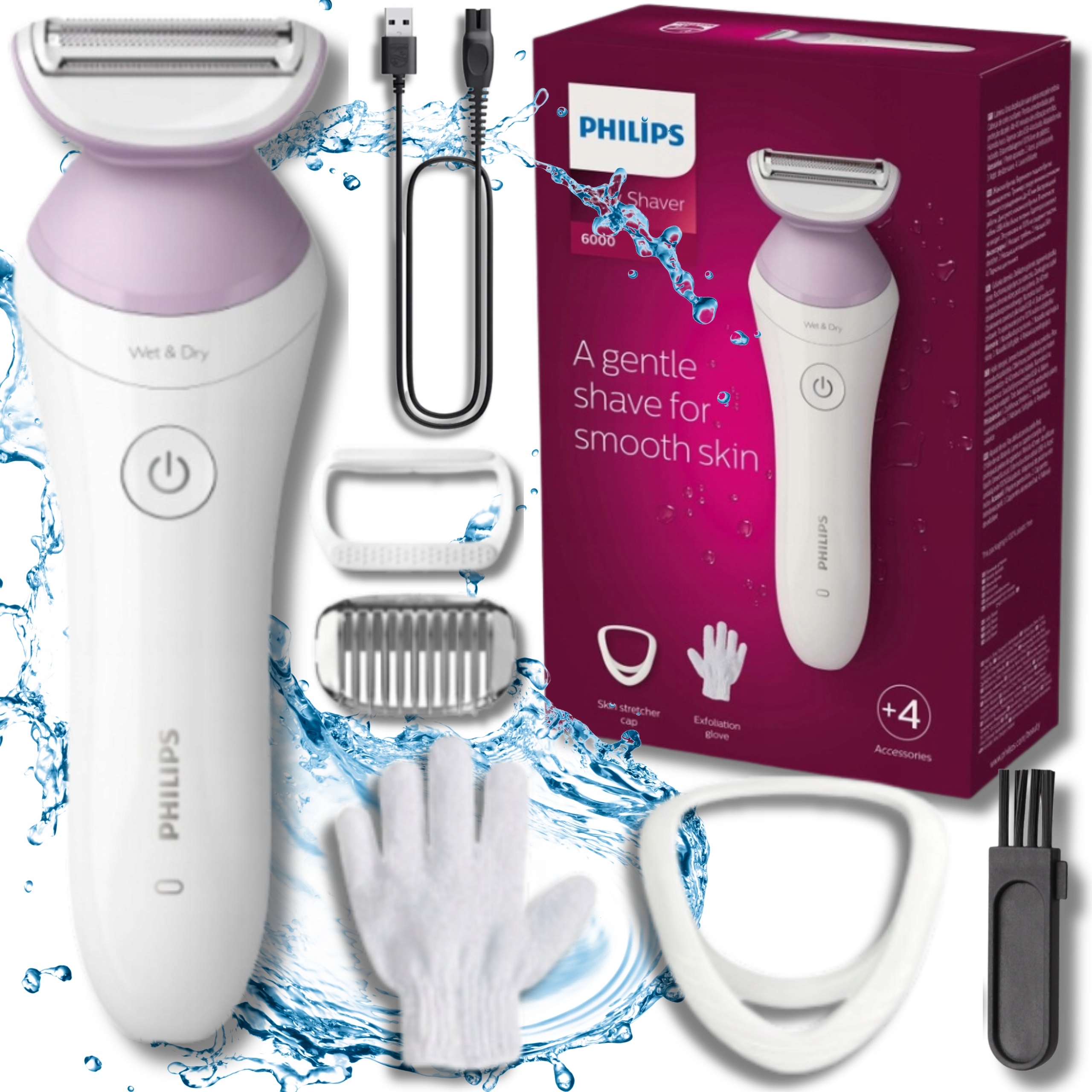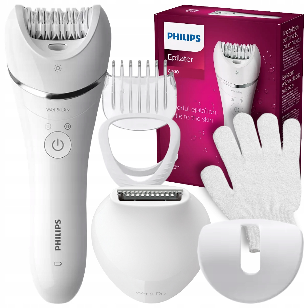 Прилагается оборудование Depilator Philips, Głowica do przycinania, Rękawica, 3x nasadka, Etui,