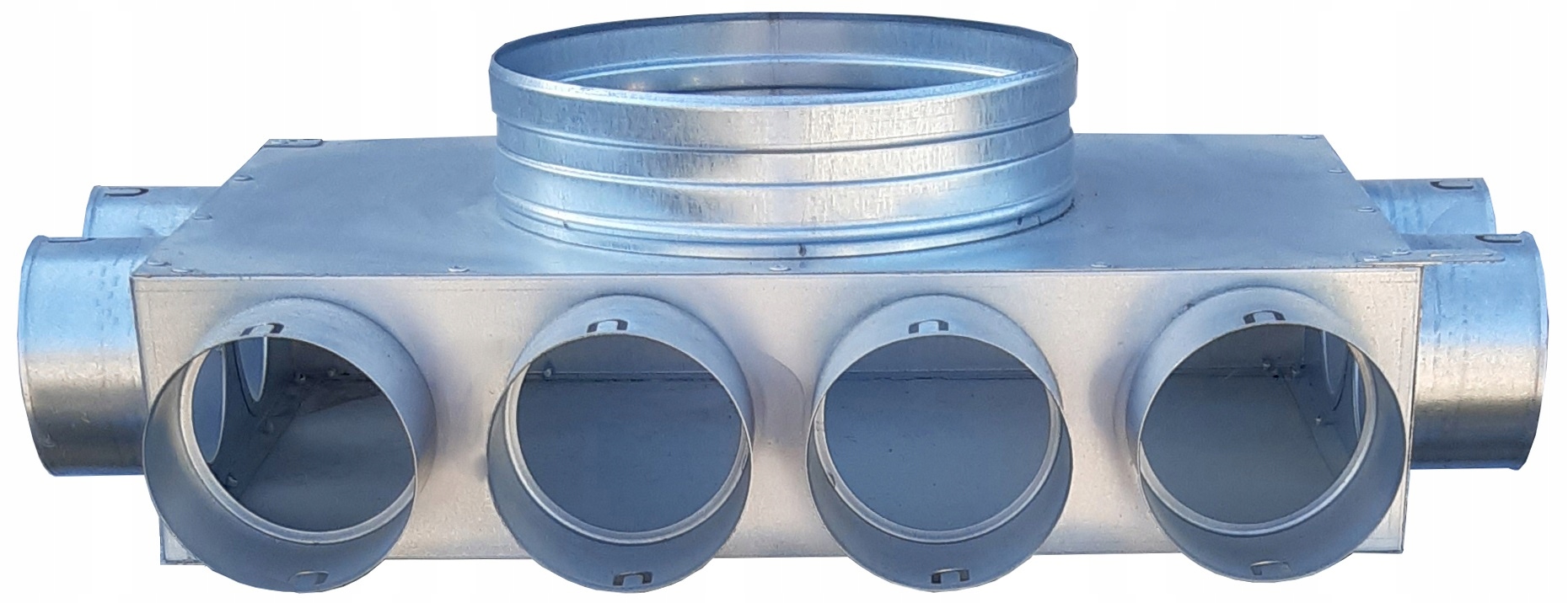 Rozdzielacz dzięki specjalnym kierownicom, płynnie przejmuje powietrze dostarczone głównym przewodem (⌀ 160 lub ⌀200mm) a następnie równomiernie kieruje je w stronę wyjść. Takie rozwiązanie zapewnia identyczne rozprowadzenie powietrza do przewodów (⌀60 lub ⌀75mm) dzięki czemu w każdym pomieszczeniu mamy jednakowy dopływ powietrza. Jest to ogromnie ważne do prawidłowego działania całego systemu.