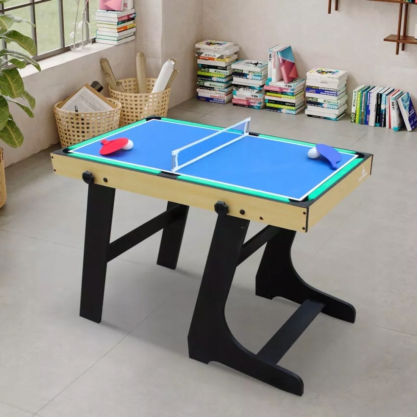 Z tym stołem 3w1 Texas możesz grać i bawić się w towarzystwie kiedy tylko chcesz. Wystarczy, że zmienisz blat i wybierzesz grę. Podstawą jest stół bilardowy, na którym można dodać blat do gry w hokeja lub ping-ponga. Oczywiście zawiera wszystkie akcesoria: kule, siatkę, rakiety, kije bilardowe, numerowane kulki, dysk, gałki. Idealny, jeśli masz mało miejsca w domu, a multi stół Texas jest składany. Aby go schować, wystarczy obrócić gałki i złożyć nogi.