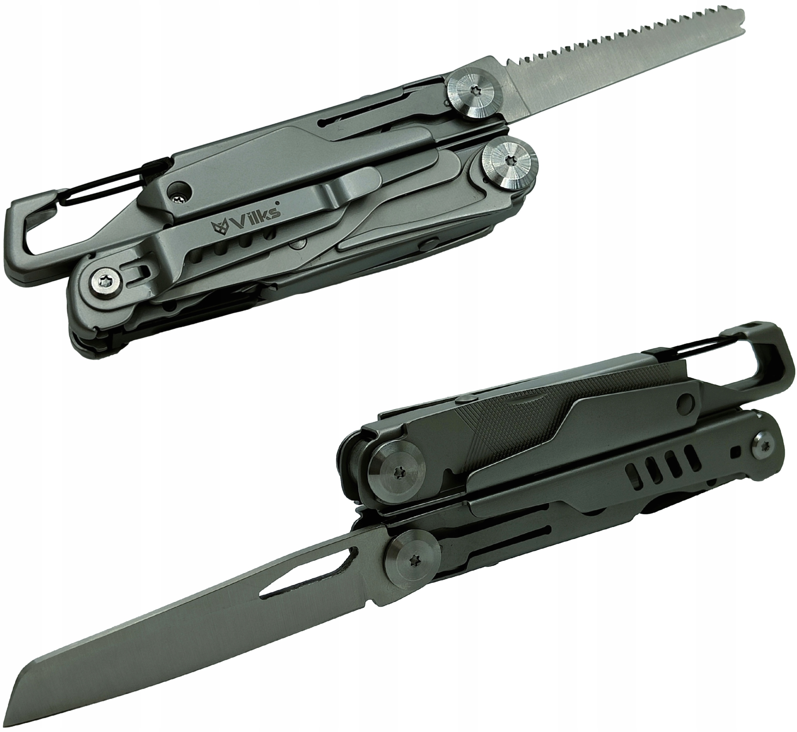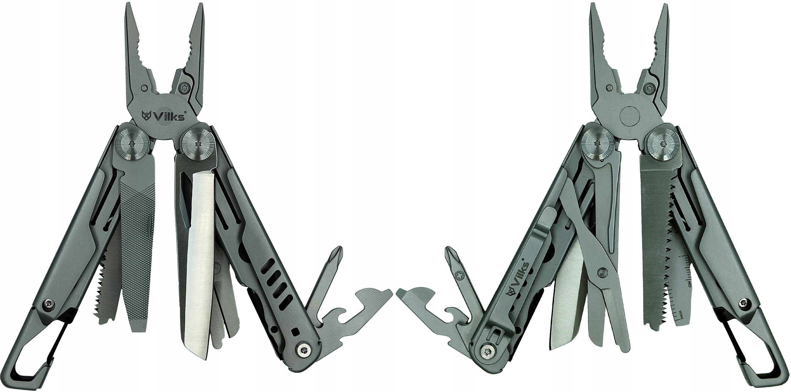 Multitool Vilks® to zestaw praktycznych narzędzi i wielu funkcji w jednym, który wykonany został z wysokiej jakości materiałów. Posiada wiele przydatnych narzędzi: kombinerki i przecinaki do drutu, nóż, nożyczki, śrubokręt krzyżakowy i dwa śrubokręty płaskie (mały i duży), otwieracz do konserw, otwieracz do puszek, szydło, zestaw 11 bitów z uchwytem magnetycznym, wymienny zapasowy kpl. przecinaków noży tnących i wiele innych.