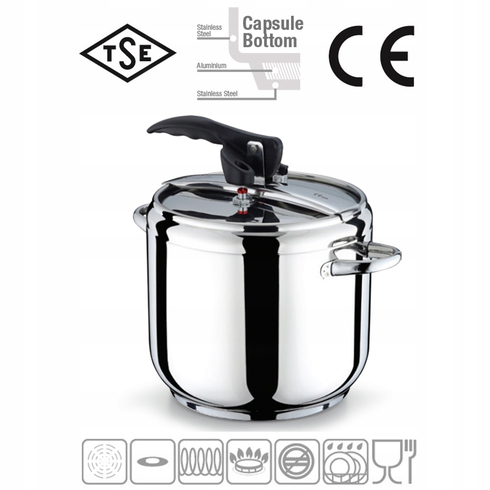Prezentujemy doskonały, 15 lt* szybkowar firmy Hascevher. Zaletą szybkowaru jest skrócenie czasu gotowania o 60%. Jest to możliwe poprzez wykorzystanie pary i podwyższonego ciśnienia podczas gotowania. Dzięki temu potrawy zachowują swój naturalny smak, aromat i składniki odżywcze które, przy zwykłym gotowaniu, po prostu ulatują z parą. Dodatkowymi zaletami szybkowarów jest oszczędność energii poprzez skrócenie czasu gotowania oraz możliwość mycia ich w zwykłych zmywarkach. Opatentowana kompozycja warstw specjalnego stopu oraz wysokogatunkowej stali szlachetnej doskonale przewodzi i akumuluje ciepło, a także odpowiednio zabezpiecza gotowane potrawy przed przypaleniem oraz chroni naczynie przed zużyciem.