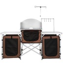 Стол для кемпинга, превышающий пространство для хранения, разделяемый с количество ингредиентов и кухонной утвари. Он также характеризуется чисткой.