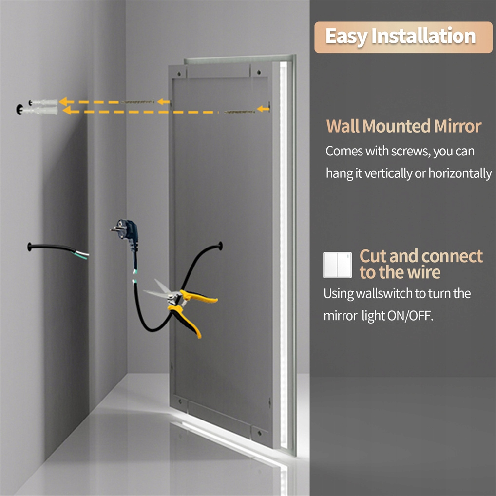 Otwory kablowe po każdej stronie lustra umożliwiają łatwe podłączenie do przewodu elektrycznego.