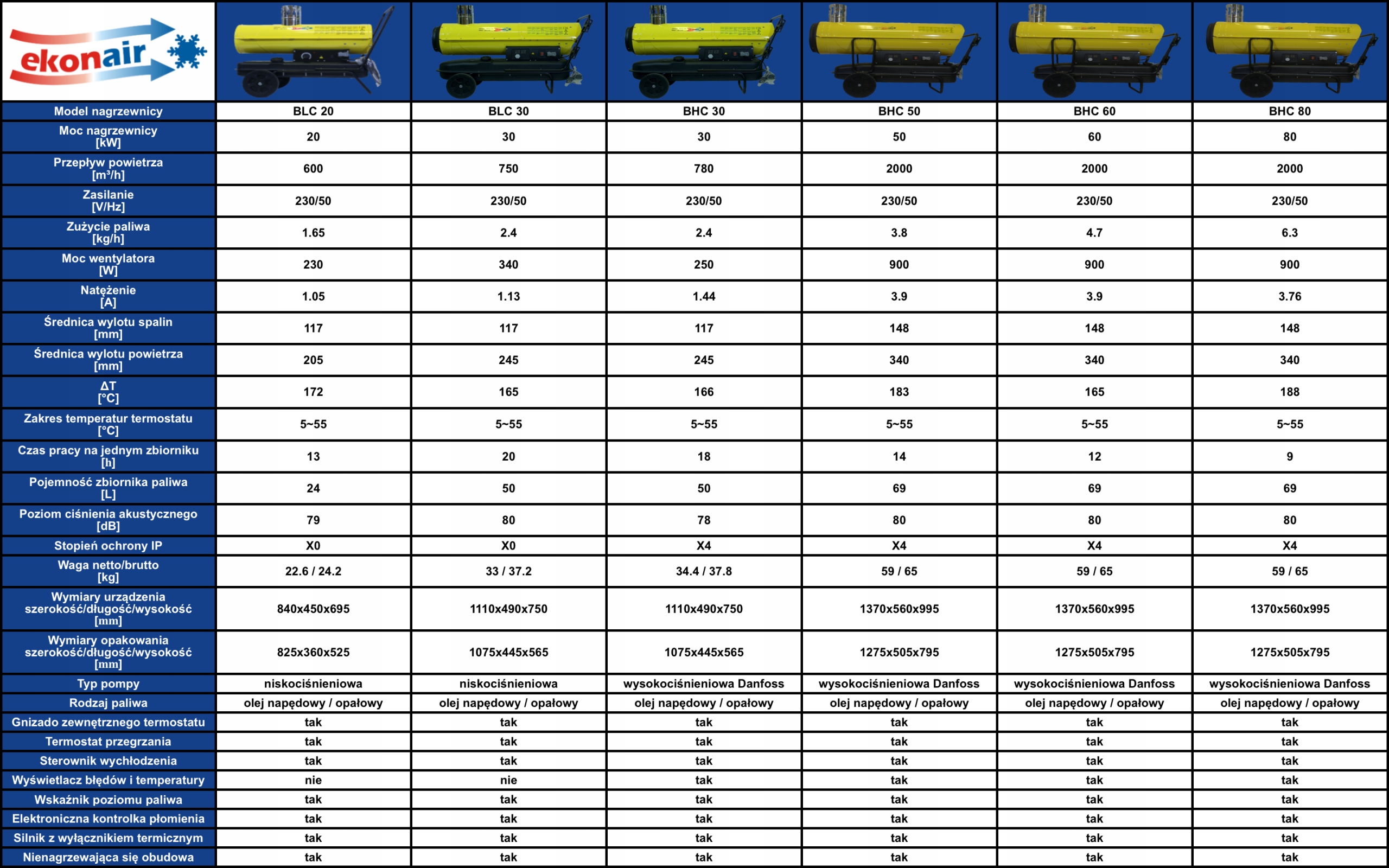 BHC 80 to nagrzewnica olejowa wysokociśnieniowa o mocy ok. 80 kW, wymiennikowa z przeznaczeniem do szybkiego ogrzewania pomieszczeń dobrze wentylowanych takich jak: place budów, fabryki, magazyny, sklepy, hale, szklarnie, pomieszczenia inwentarskie. Można nimi ogrzewać całe obiekty jak również wybrane miejsca.
