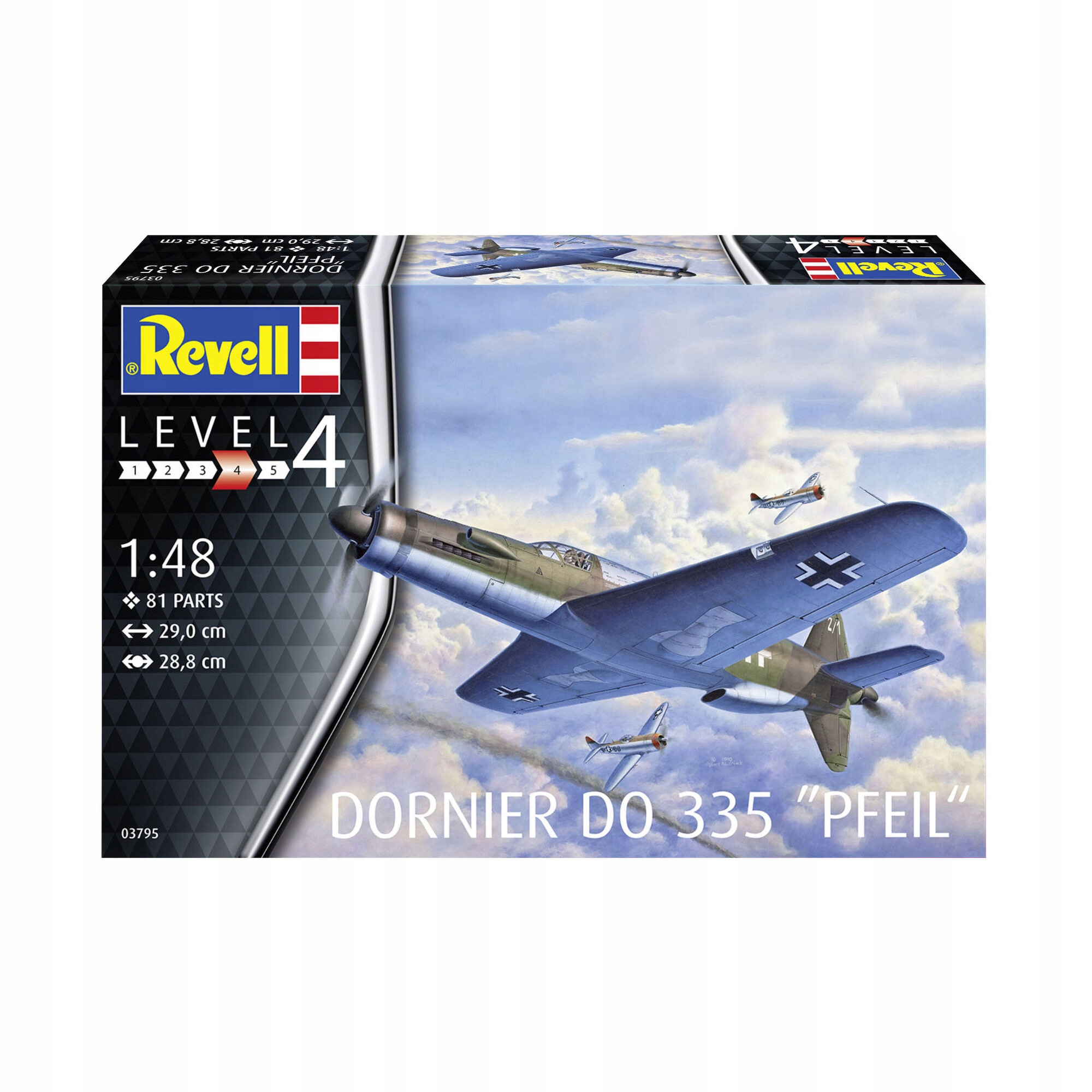 Dornier Do 335 był niemieckim wielozadaniowym myśliwcem wyprodukowanym przez firmę Dornier podczas II wojny światowe. Nietypowo dla konstrukcji niemieckich samolotów, miał jeden silnik z przodu i jeden z tyłu. Dzięki temu Do 335 był najszybszym samolotem napędzanym silnikiem tłokowym w momencie swojego pierwszego lotu w 1943 roku, za co ostatecznie zyskał przydomek "Strzała". - Dokładnie odwzorowana struktura skrzydeł - Figurki w zestawie - Historyczna kalkomania