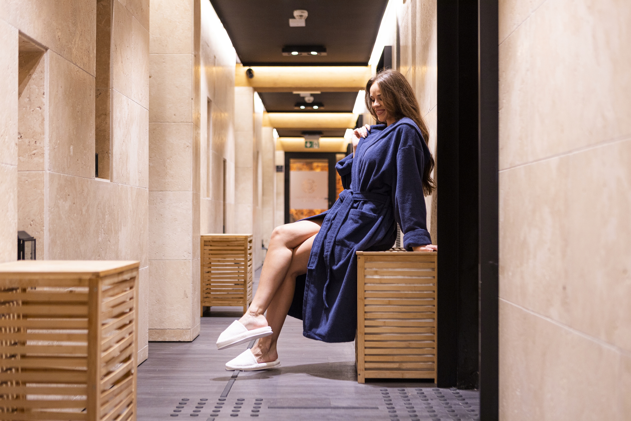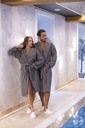 Elegancki Szlafrok Z kapturem z gęsto tkaną bawełną. Specjalne procesy technologiczne, sprawiają, że szlafrok jest bardzo solidny, jego struktura "zbita", a zaciągnięcia materiału są wręcz niemożliwe.