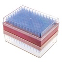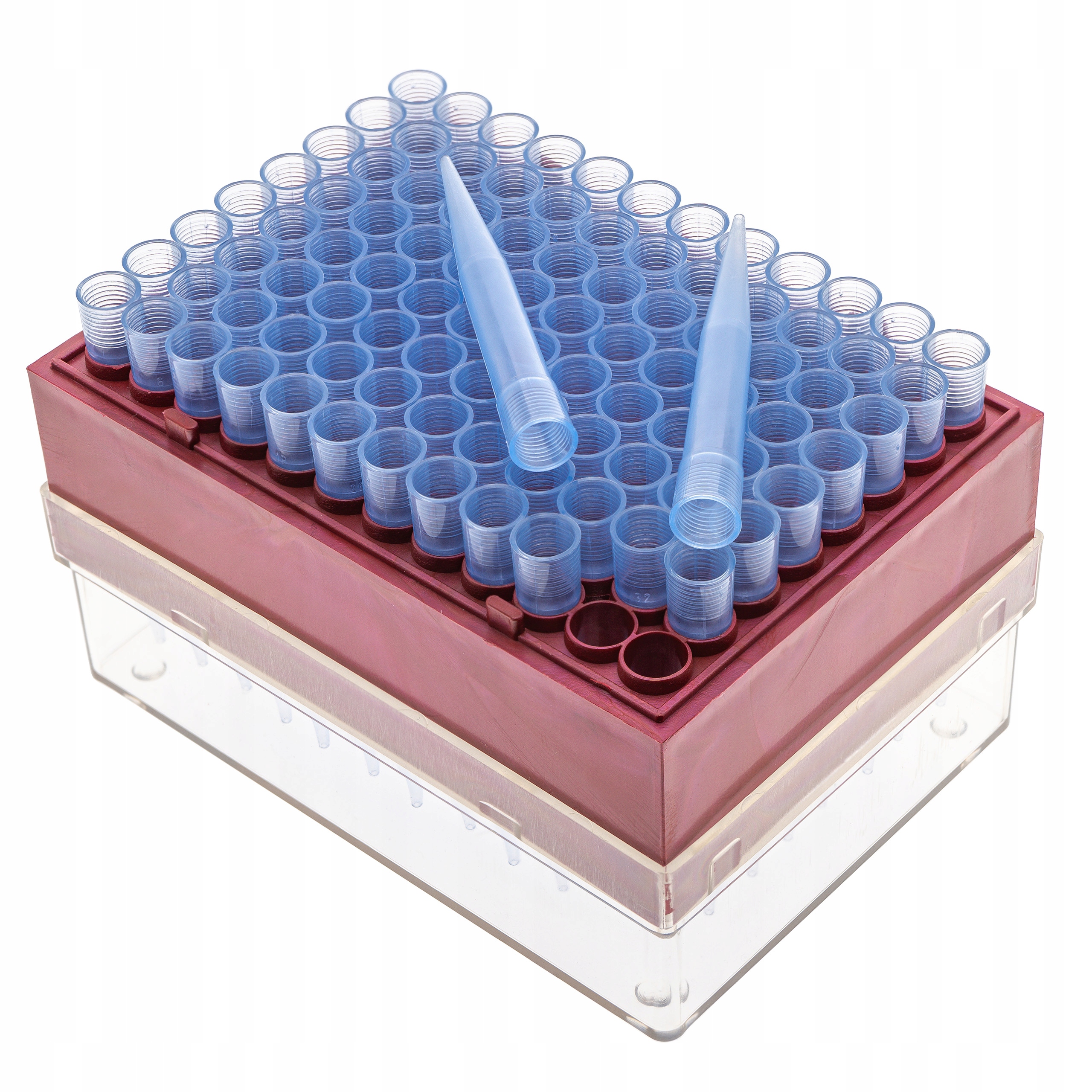 Końcówki do pipet automatycznych, przeznaczone do dozowania objętości 200-1000 µl, wykonane z polipropylenu (PP). Produkt zawiera zestaw 96 końcówek umieszczonych w pudełku z przezroczystym wieczkiem, które może służyć jako statyw laboratoryjny.