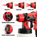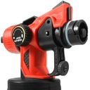 Elektryczny pistolet do malowania marki Notig Tools został wyposażony w wytrzymały i wydajny silnik o mocy 550 W. Urządzenie umożliwia nanoszenie farb o różnych gęstościach, farby na bazie wody, rozpuszczalnika, lakiery, podkłady, farby wykończeniowe, uszczelniające czy do gruntowania drewna. Dzięki natryskowi można pomalować szybko i dokładnie trudno dostępne miejsca, umożliwia równomierne pokrycie farbą nieregularnych powierzchni. Odpowiedni strumień otrzymujemy obracając dyszą. Dzięki wbudowanej sprężarce nie wymaga zewnętrznego zasilania sprężonym powietrzem. Włącznik w spuście pistoletu posiada regulacją przepływu farby.