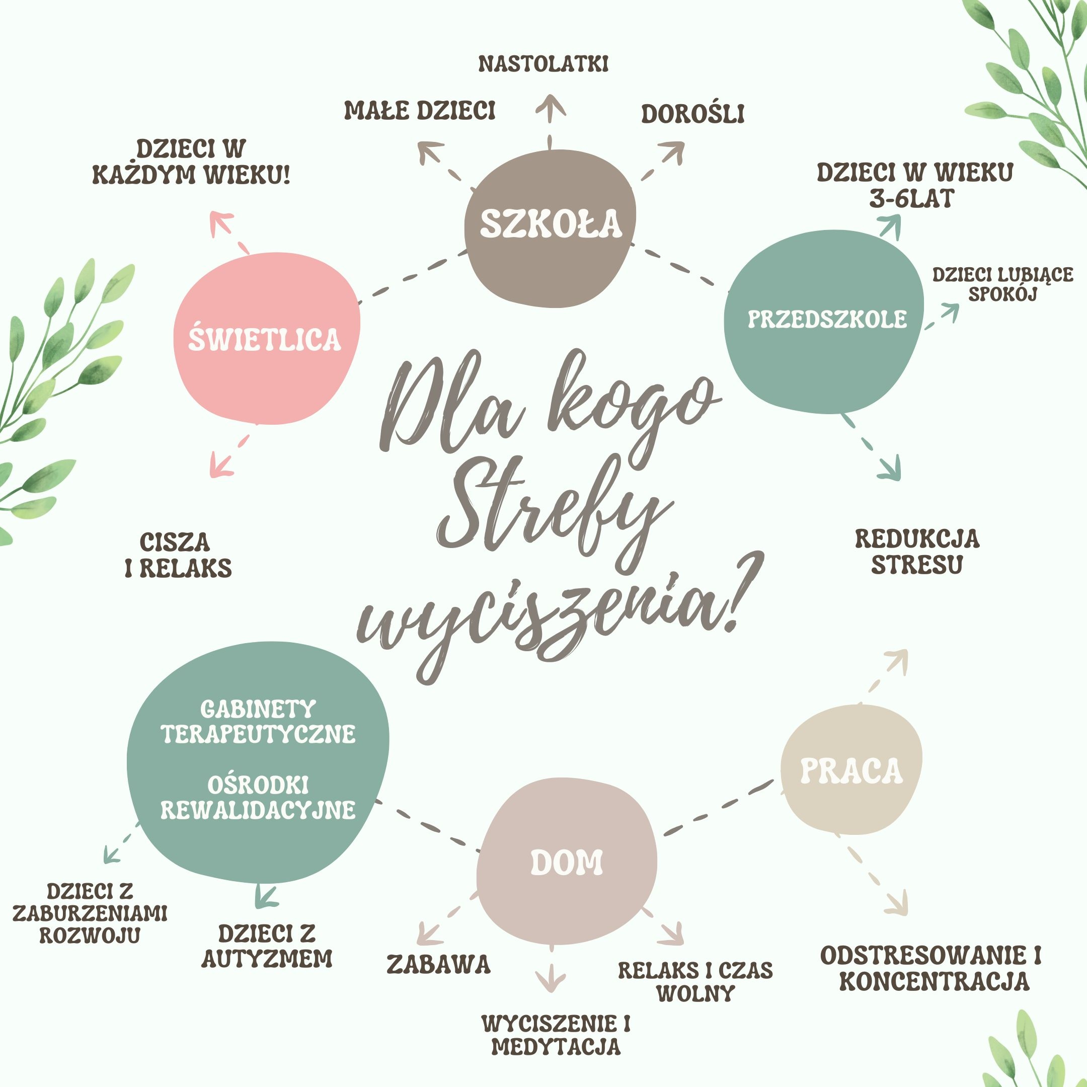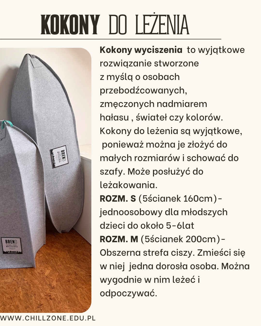 Kokony wyciszenia to wyjątkowe rozwiązanie stworzone z myślą o osobach przebodźcowanych, zmęczonych nadmiarem hałasu , świateł czy kolorów. Kokony do leżenia są wyjątkowe, ponieważ można je złożyć do mniejszych rozmiarów i schować do szafy. Może posłużyć do leżakowania. Domki z dnem szczególnie pomocne są dla dzieci, ponieważ są stabilne a dno zapewnia dodatkowy komfort użytkowania nawet podczas leżenia. Kokony idealne w edukacji włączającej dla dzieci, które bardzo potrzebują chwili wyciszenia. Sprawdzają się doskonale w placówkach przedszkolnych i szkolnych.